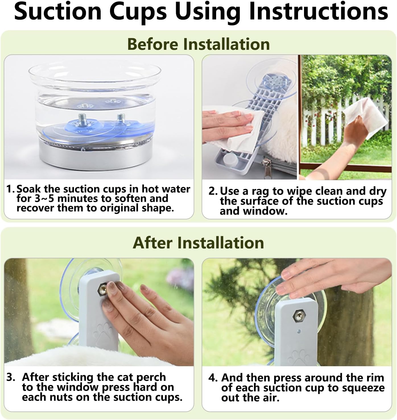 The window perch can be easily installed using the four suction cups provided, ensuring a secure fit on your window.