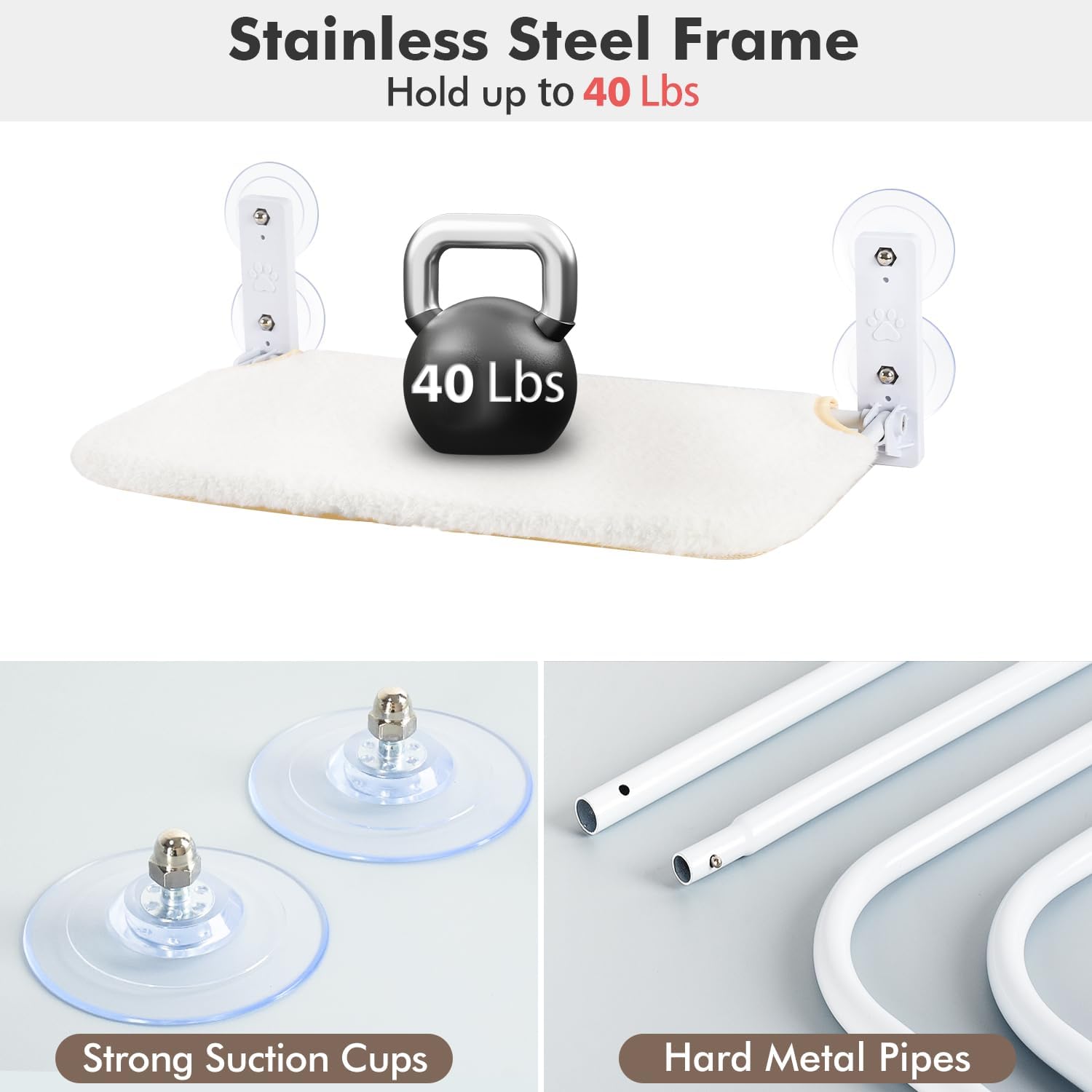 AMOSIJOY Cordless Cat Window Perch with 4 Suction Cups, Solid Metal Frame and Reversible Two Fabrics Cover, Foldable Cat Beds for Indoor Cats (Medium-White)