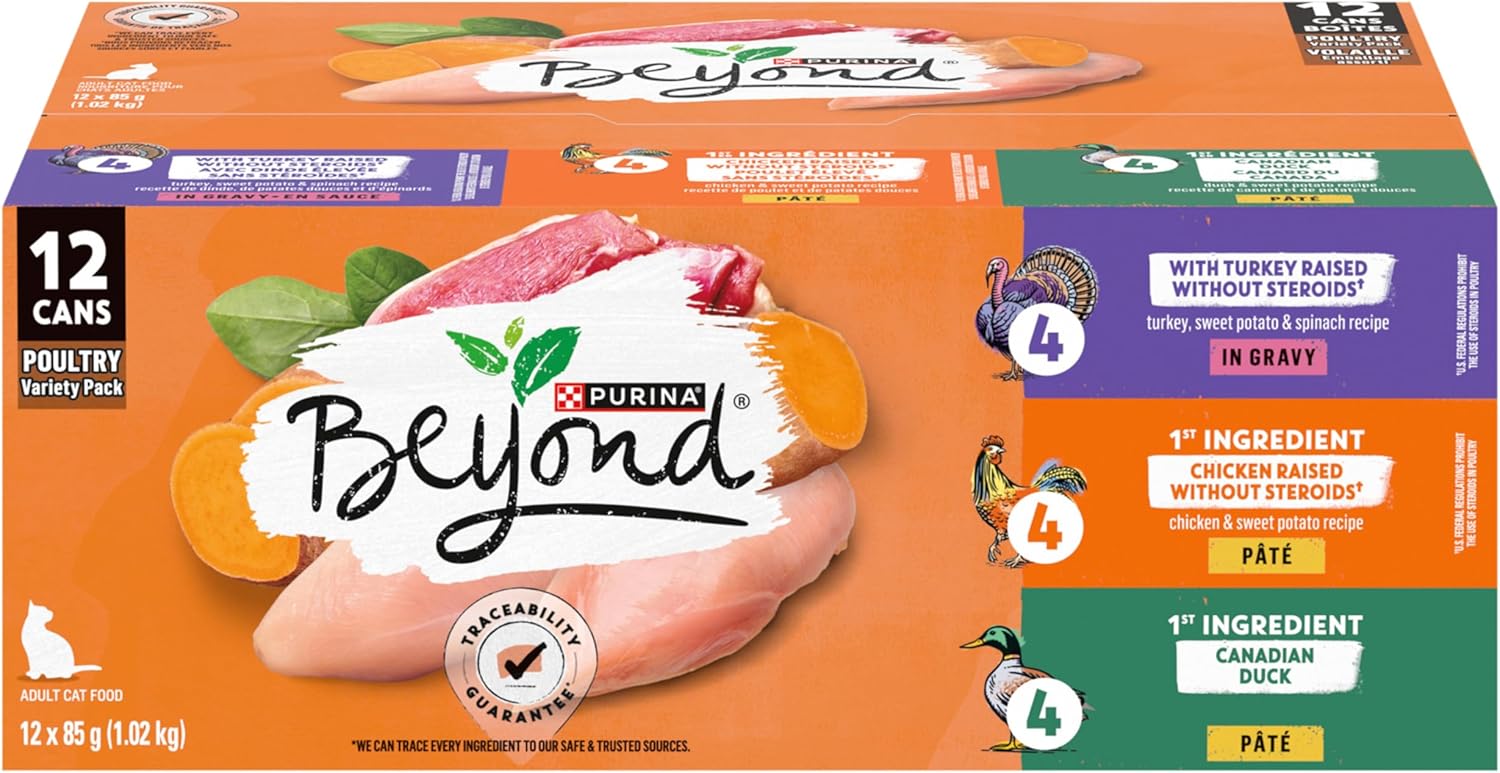 Purina Beyond Wet Cat Food offers a natural and nutritious meal option for your feline friend. This poultry variety pack includes three delicious flavors featuring real chicken, turkey, or duck as the primary ingredient. Each can is crafted with wholesome vegetables, ensuring your cat enjoys a balanced diet. The food is grain-free and contains no artificial colors, flavors, or preservatives, making it a trustworthy choice for pet owners. This variety pack is designed to provide essential nutrients for your cat's long-term health and well-being.