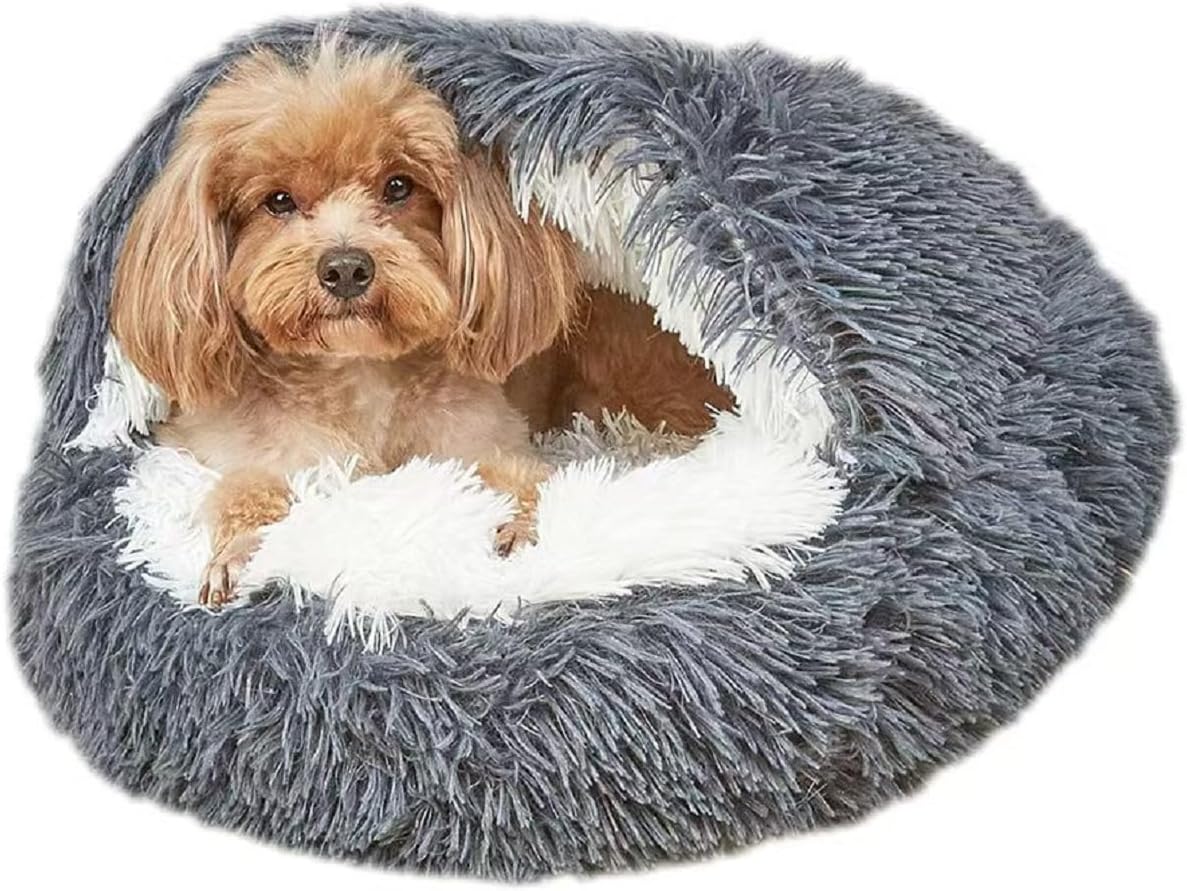 Cat Bed Round Fluffy Hooded Cat Bed Cave, Anti-Anxiety Cave Bed with Hooded Blanket, Cozy Cuddler Luxury Puppy Pet Bed, Anti-Slip Bottom and Machine Washable (Charcoal Grey, Medium)