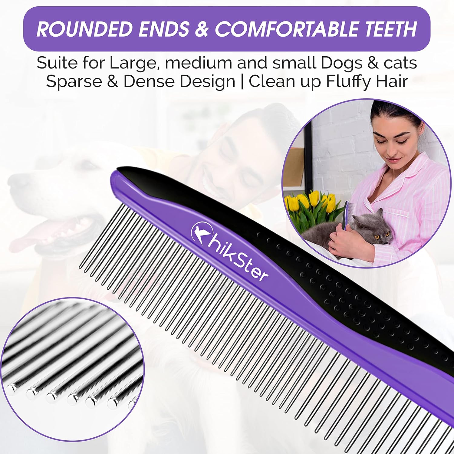 Cat Comb, Dog Comb for Grooming, Pet Comb with Wide and Narrow Stainless Steel Rounded Teeth, Non Slip Rubber Handle for Home Grooming Kit Removes Knots, Matts and Tangles, Peigne Pour Chien