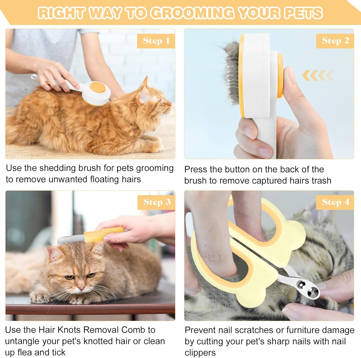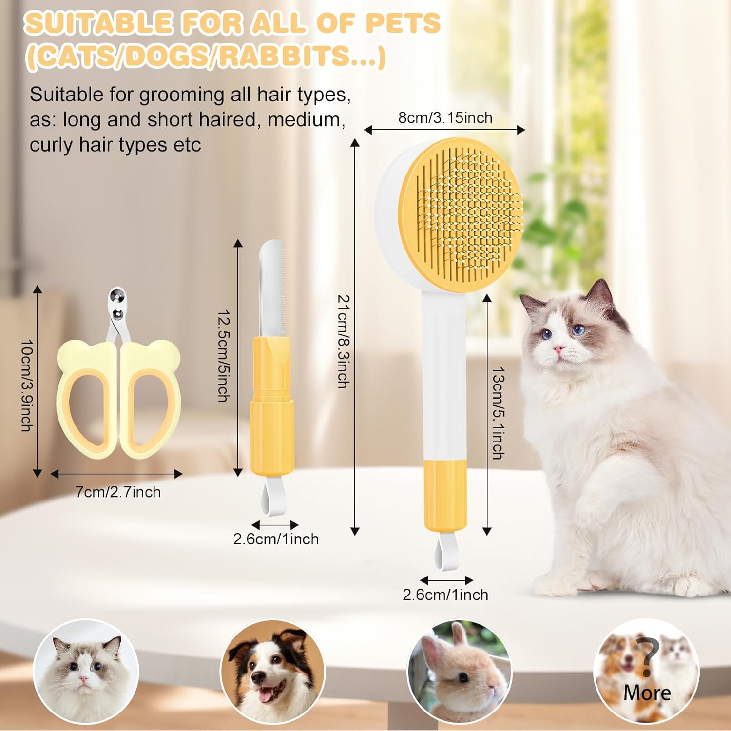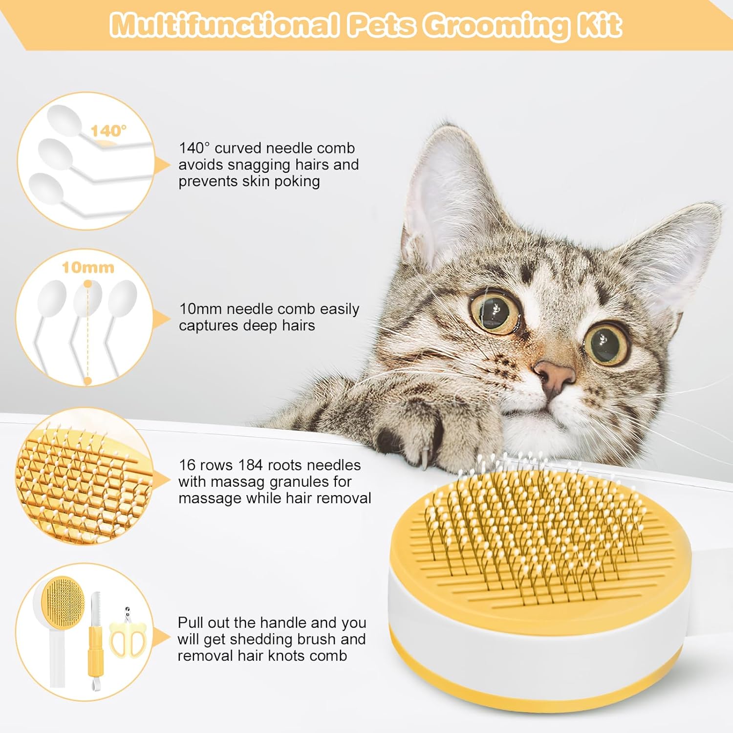 Cat Hair Brush for Deshedding, 3 in 1 Pet Hair Removal Comb Grooming Kit with Nail Clippers & Hair Knots Removal Comb, Pet Self Cleaning Slicker Brush for Long Short Haired Cats Dogs Kitten (Yellow)