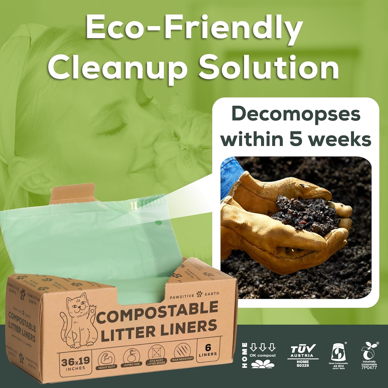 Cat Litter Box Liners 100% Compostable – Drawstring Close – 6 Count – Jumbo Size 36″ x 19″ – Tear & Leak Resistant – OK Compost Home Certified