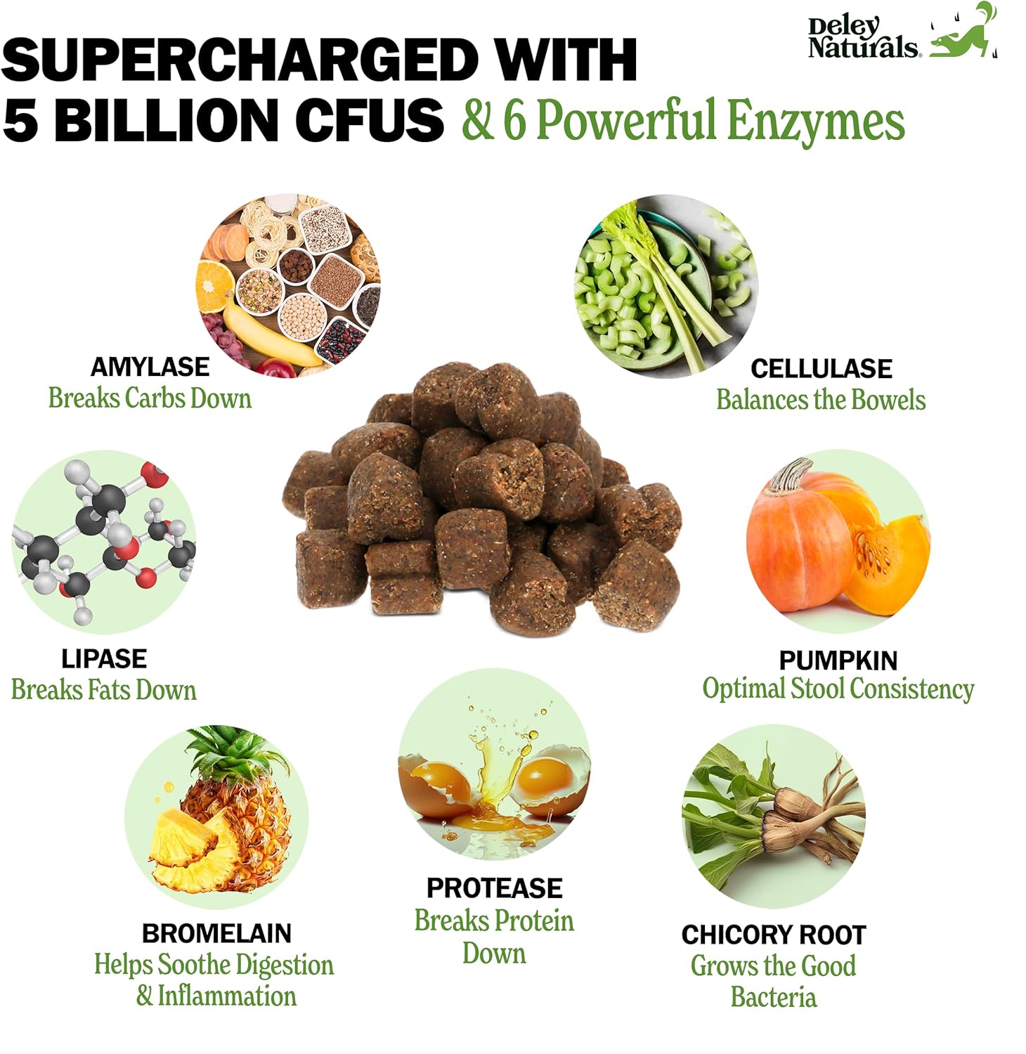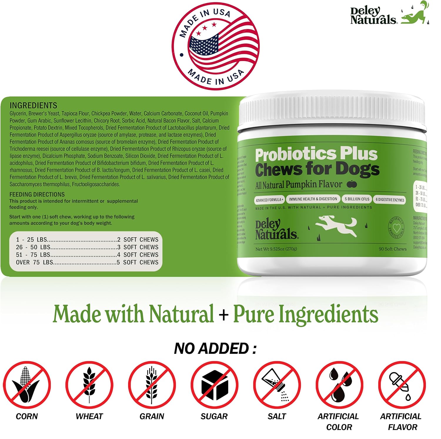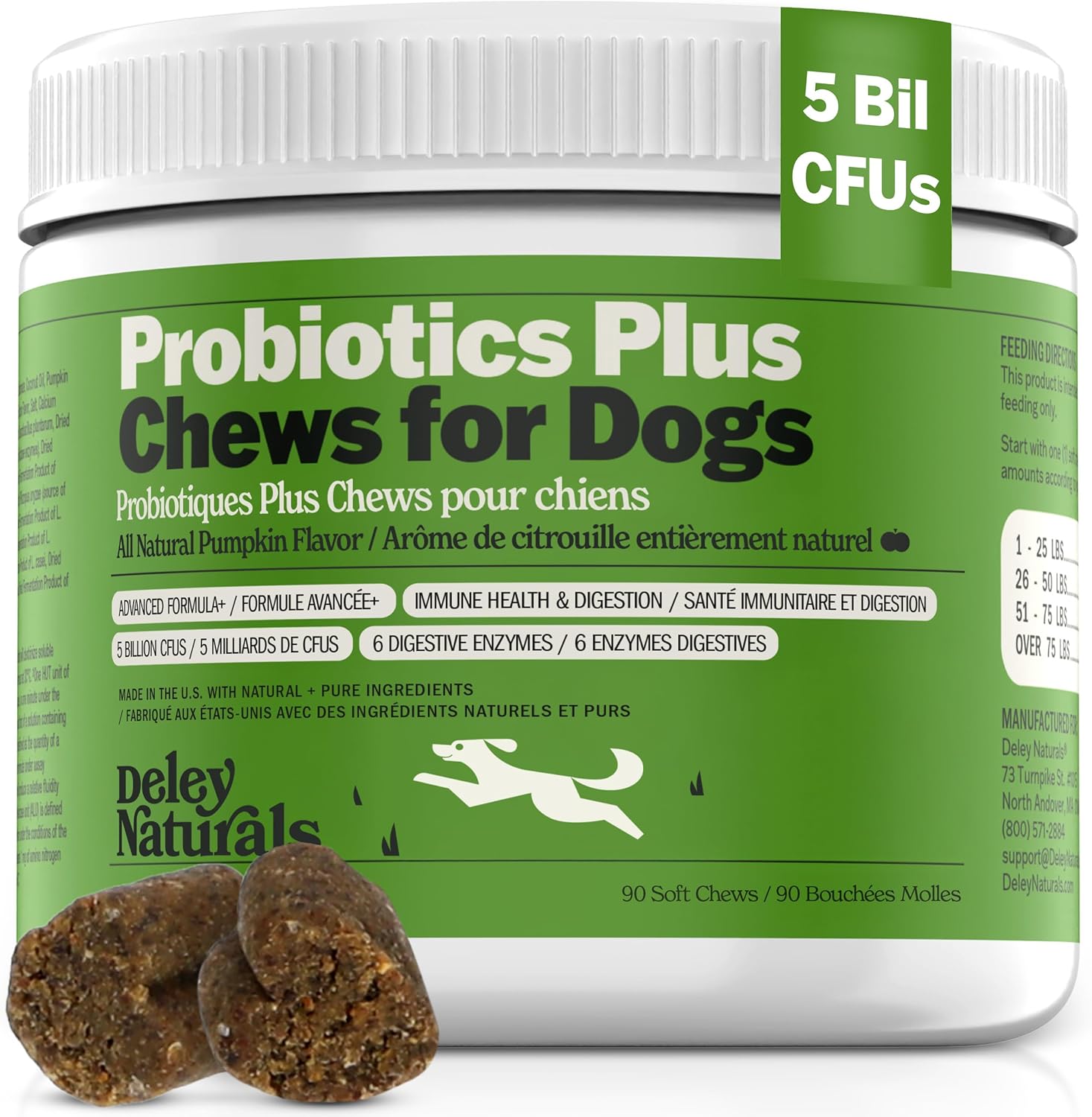 Deley Naturals Probiotics Plus Chews for Dogs – Gut Health Supplement with 5 Billion CFUs, Digestive Enzymes & Probiotics – Pumpkin Flavor Probiotic Chews for Allergies, Diarrhea & Yeast – 90 Chews