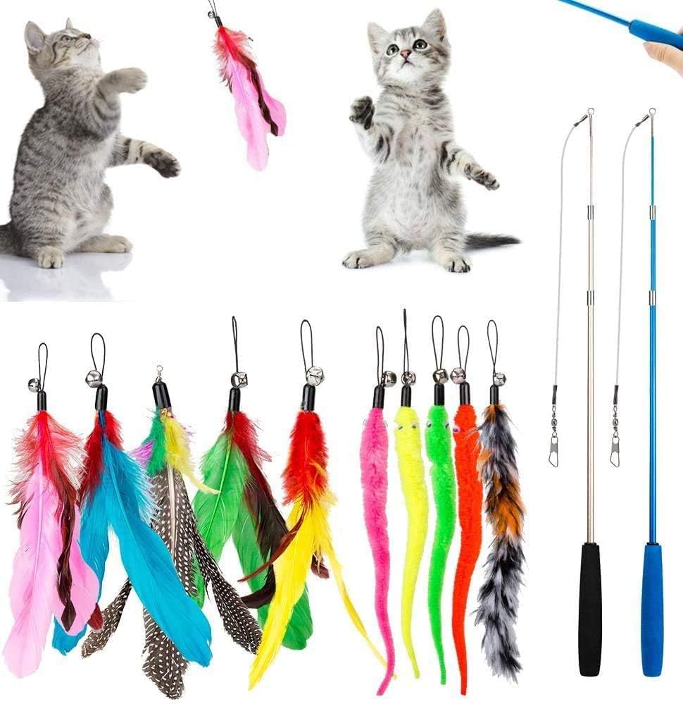 DILISS Feather Teaser Cat Toy, 2PCS Retractable Cat Wand Toys and 10PCS Replacement Teaser with Bell Refills, Interactive Catcher Teaser and Exercise Playing Toy for Kitten or Cats