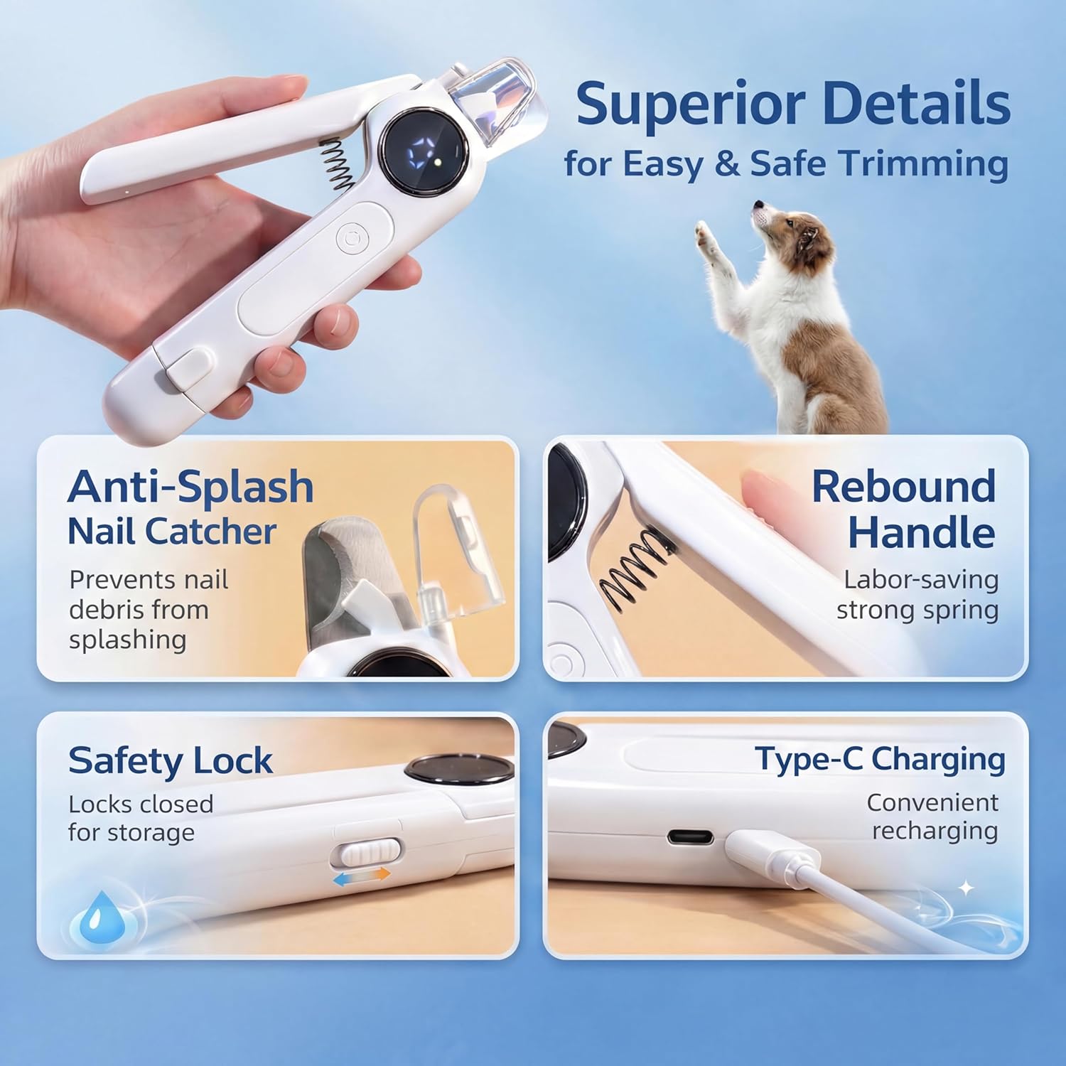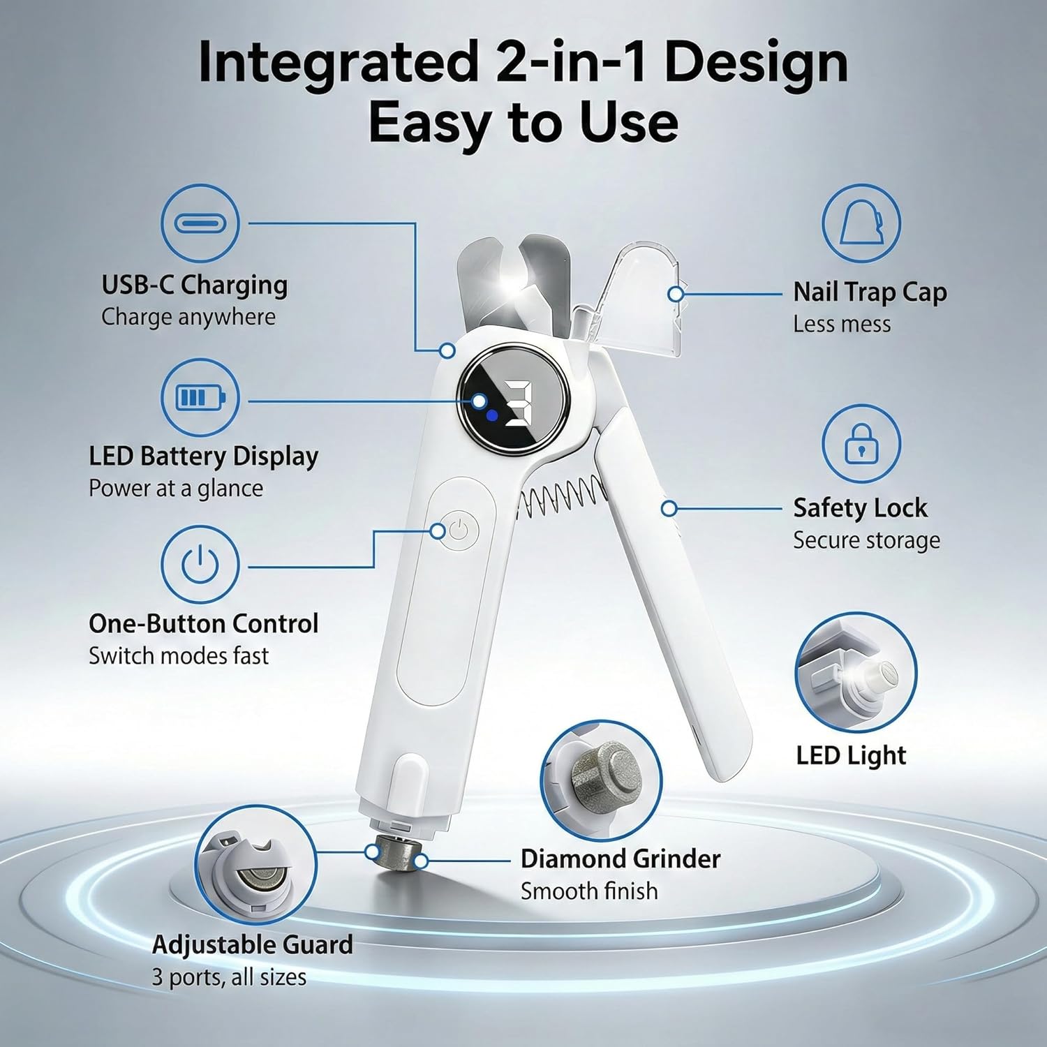 The Dog Nail Clippers & Grinder 2-in-1 is designed for pet owners seeking a safe and efficient way to trim their pets' nails. This electric pet trimmer features a quiet operation with three speed settings, making it suitable for dogs and cats of all sizes. The built-in LED light helps illuminate the nail, ensuring precision during grooming. Additionally, the splash guard minimizes mess, while the cordless design offers convenience and ease of use.