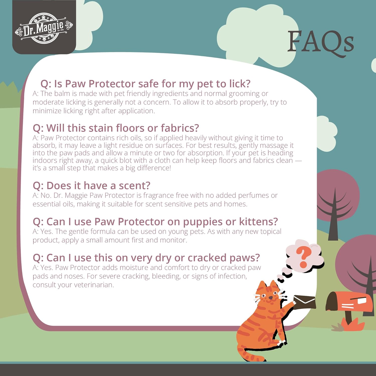 Dr. Maggie Paw Protector is designed for year-round paw care, providing essential protection against harsh environmental conditions. Its gentle formula helps maintain moisture balance and conditions paws effectively. This protective paw wax is ideal for shielding your pet's paws from ice, salt, snow, hot pavement, and abrasive surfaces.