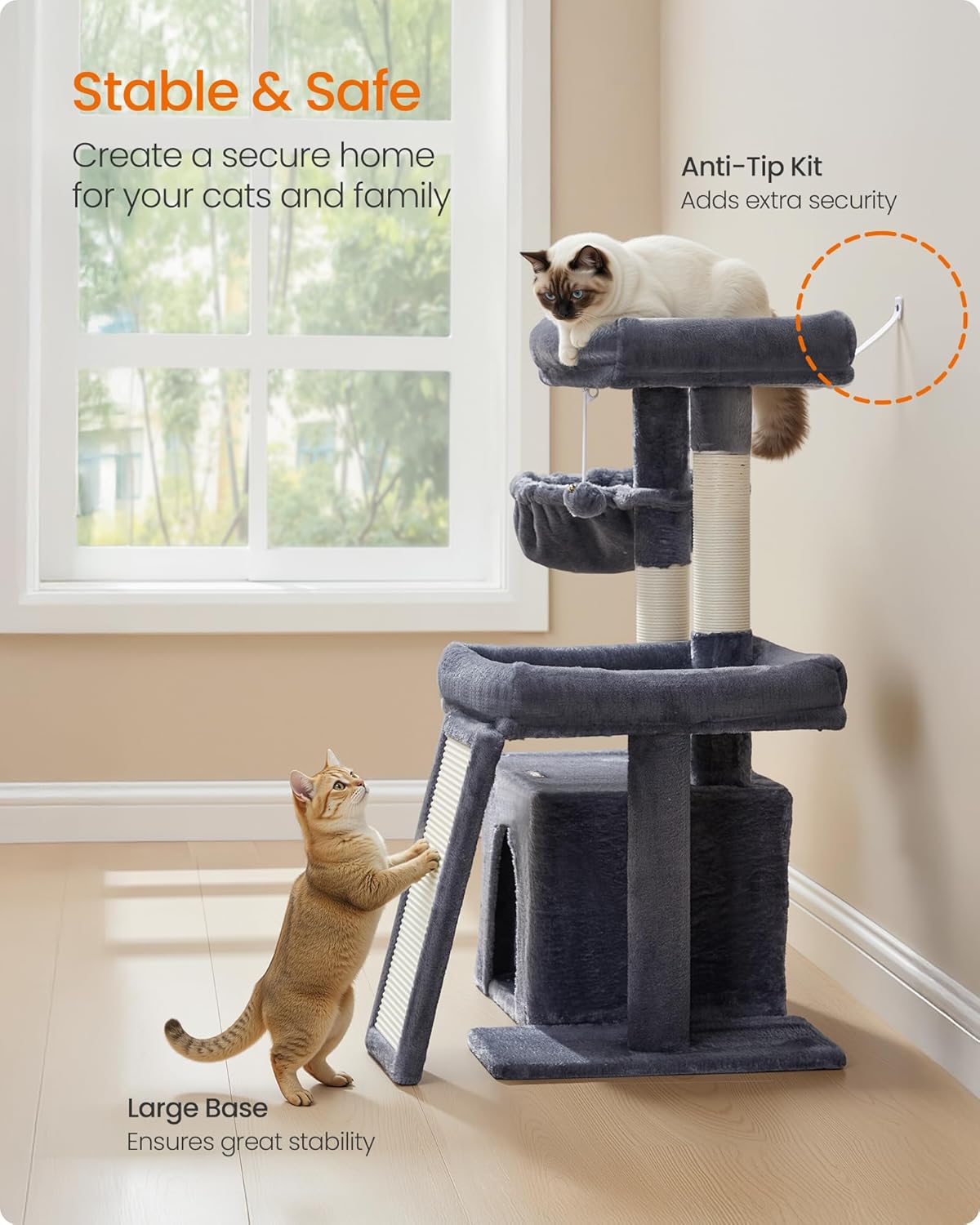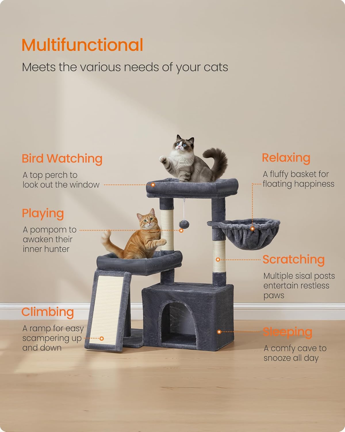 Feandrea Cat Tree Tower Condo for Small and Medium Cats, with Scratching Posts and Ramp, 2 Perches, Cave, Basket, Dark Gray UPCT013GS01