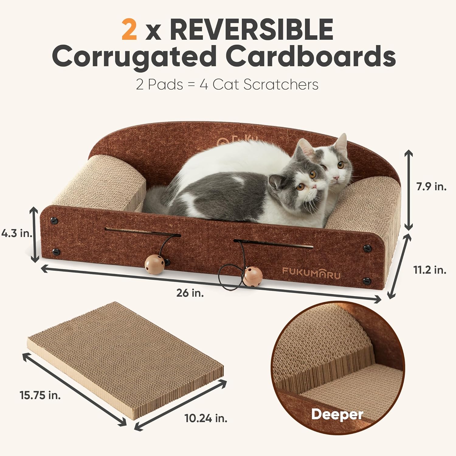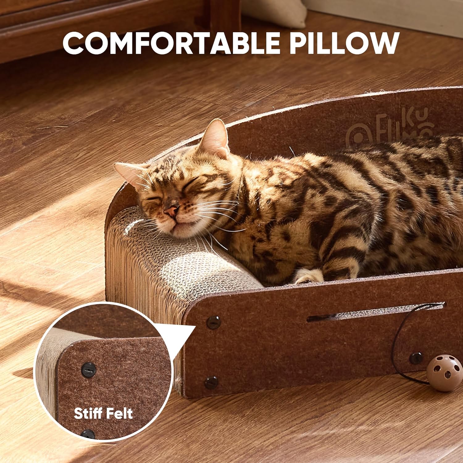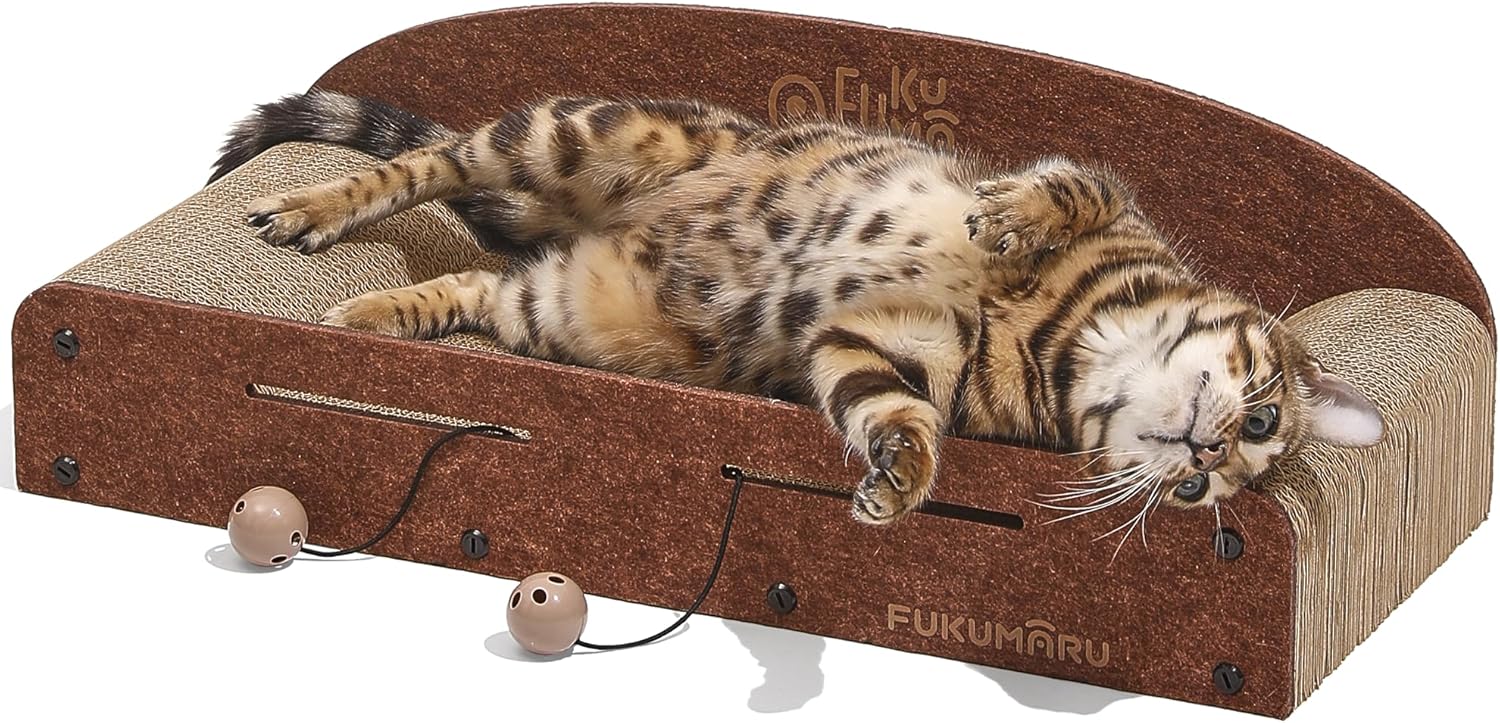 The FUKUMARU 26 Inch Cat Scratcher Cardboard Lounge Bed is designed to cater to your cat's natural scratching instincts. This durable cardboard lounge not only serves as a scratcher but also as a cozy resting spot. The product includes two reversible scratching pads, ensuring longevity and versatility. Its caramel color blends well with various home decors.