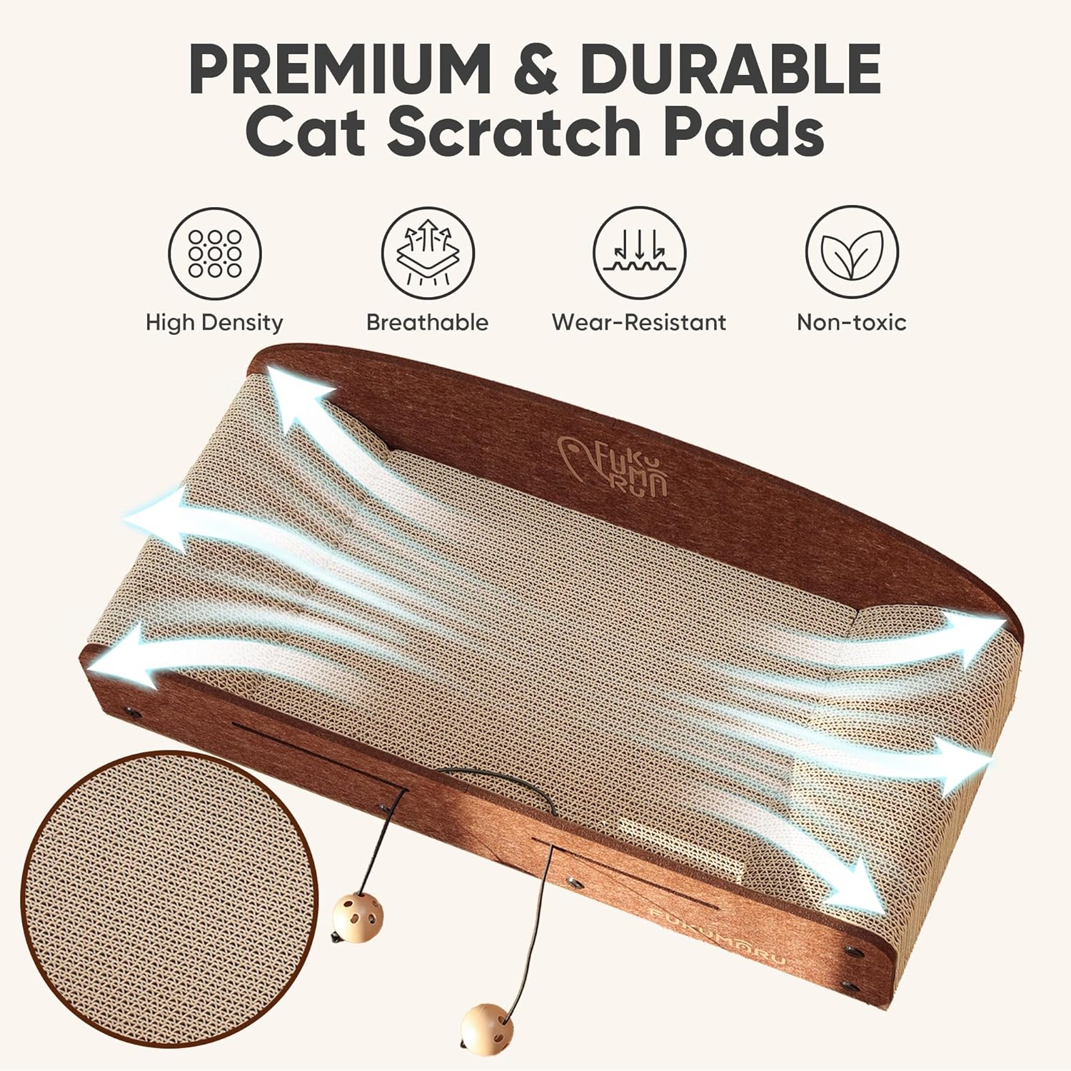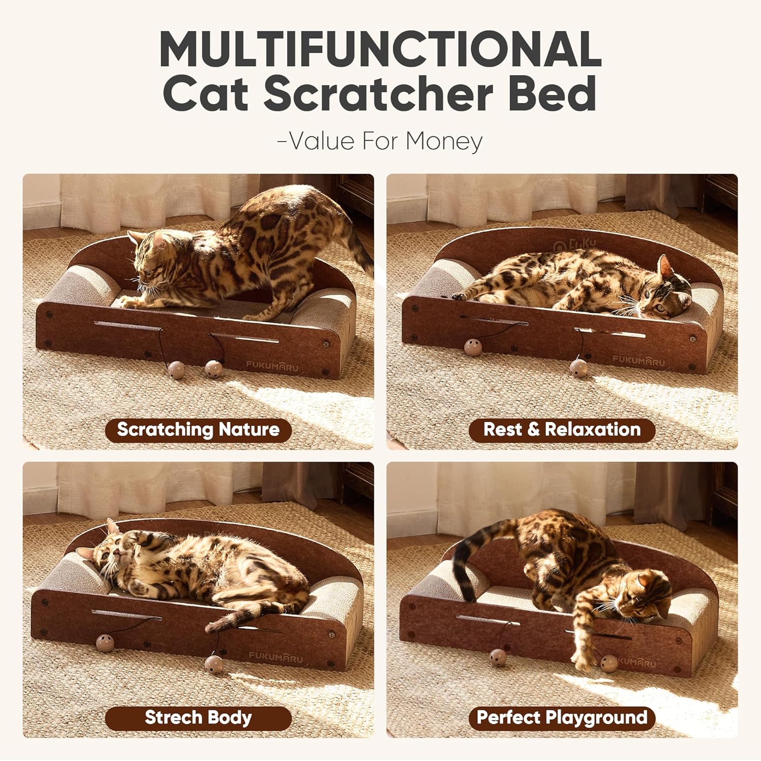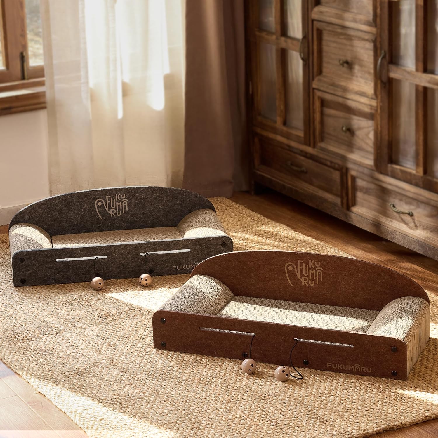 The FUKUMARU 26 Inch Cat Scratcher Cardboard Lounge Bed is designed to cater to your cat's natural scratching instincts. This durable cardboard lounge not only serves as a scratcher but also as a cozy resting spot. The product includes two reversible scratching pads, ensuring longevity and versatility. Its caramel color blends well with various home decors.