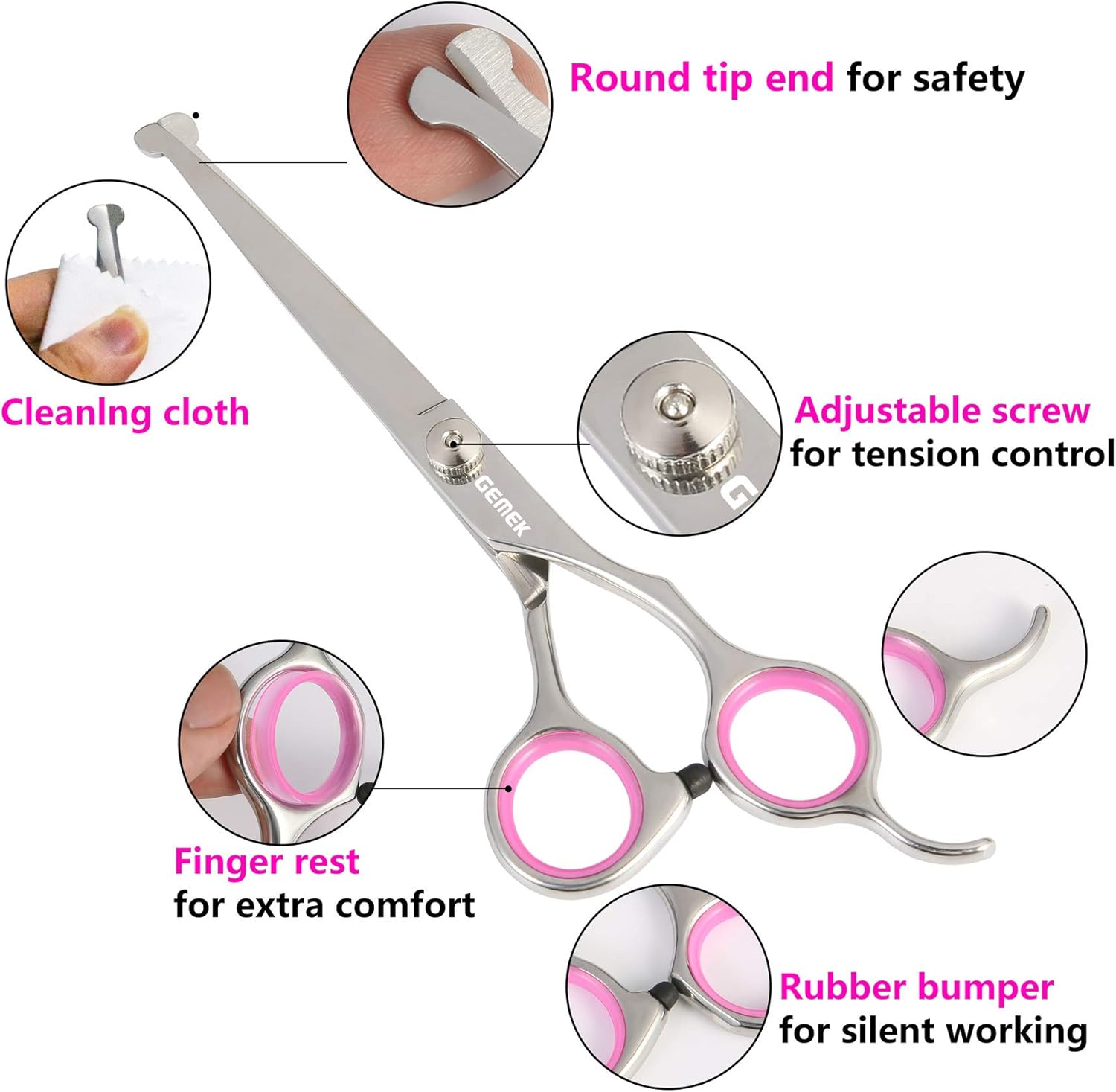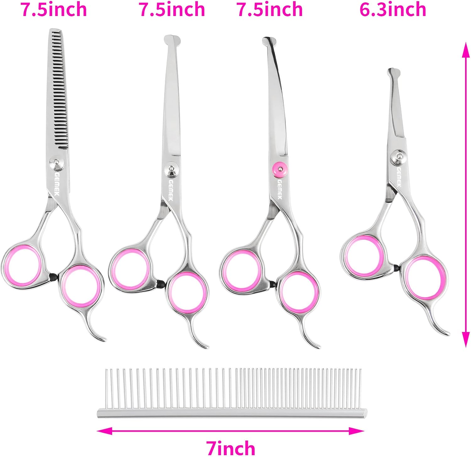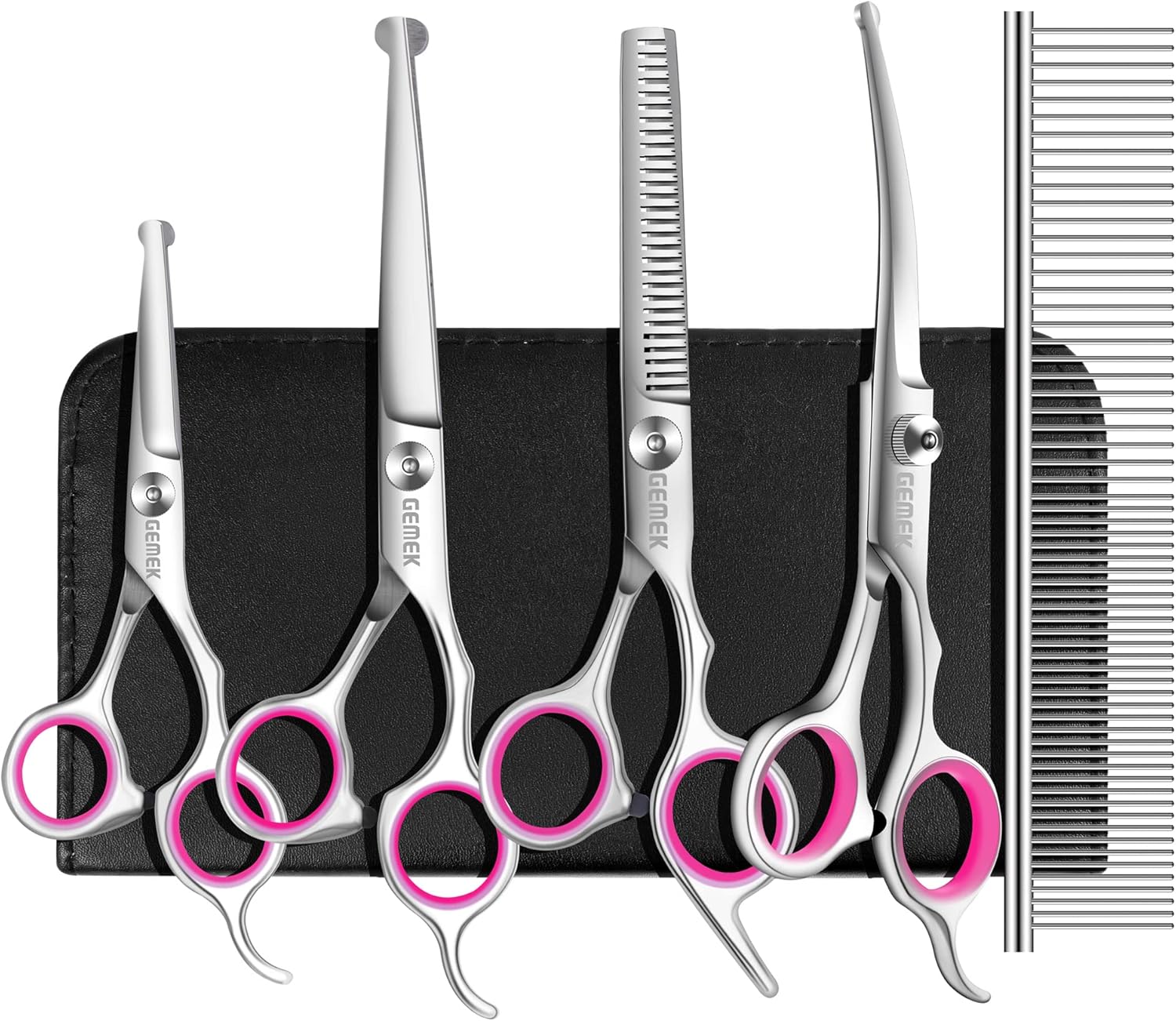 GEMEK Dog Grooming Scissors Set, 4CR Stainless Steel Safety Round Tip Pet Professional Grooming Tool 5 Pieces Kit – Straight, Curved, Thinning Shears & Comb for Dogs, Cats and Other Animals