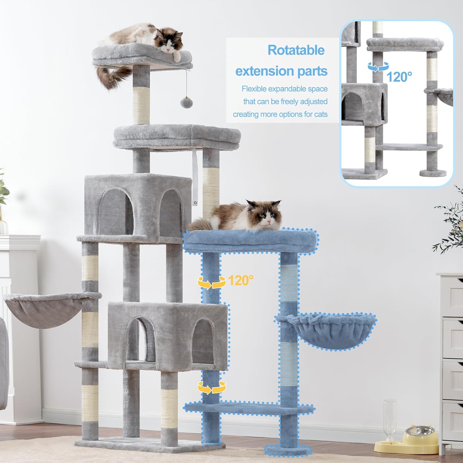 Hey-brother Cat Tree Tower, Scratching Posts with a Extended Part, Wide Platforms, Cozy Condos, Hammocks, Sisal Columns and Ball for Indoor Cats, 70.1 Inches, Light Gray MPJ038W
