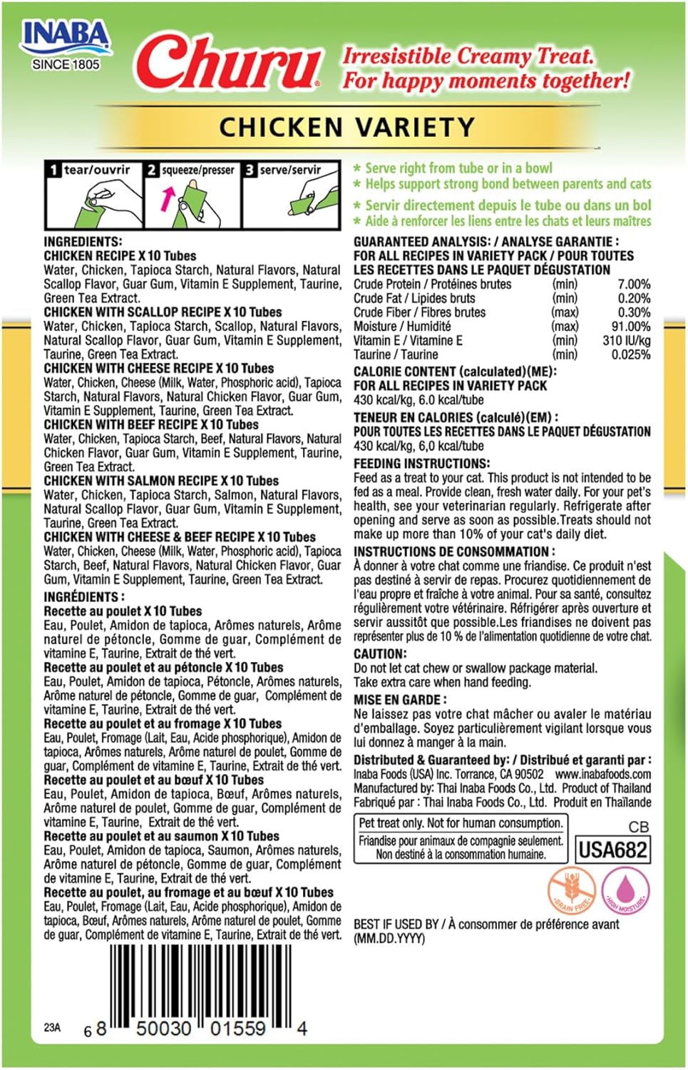 INABA Churu Cat Treats, Lickable, Squeezable Creamy Purée Cat Treat with Green Tea Extract & Taurine, 14 Grams Each Tube, 60 Tubes, Chicken Variety Box