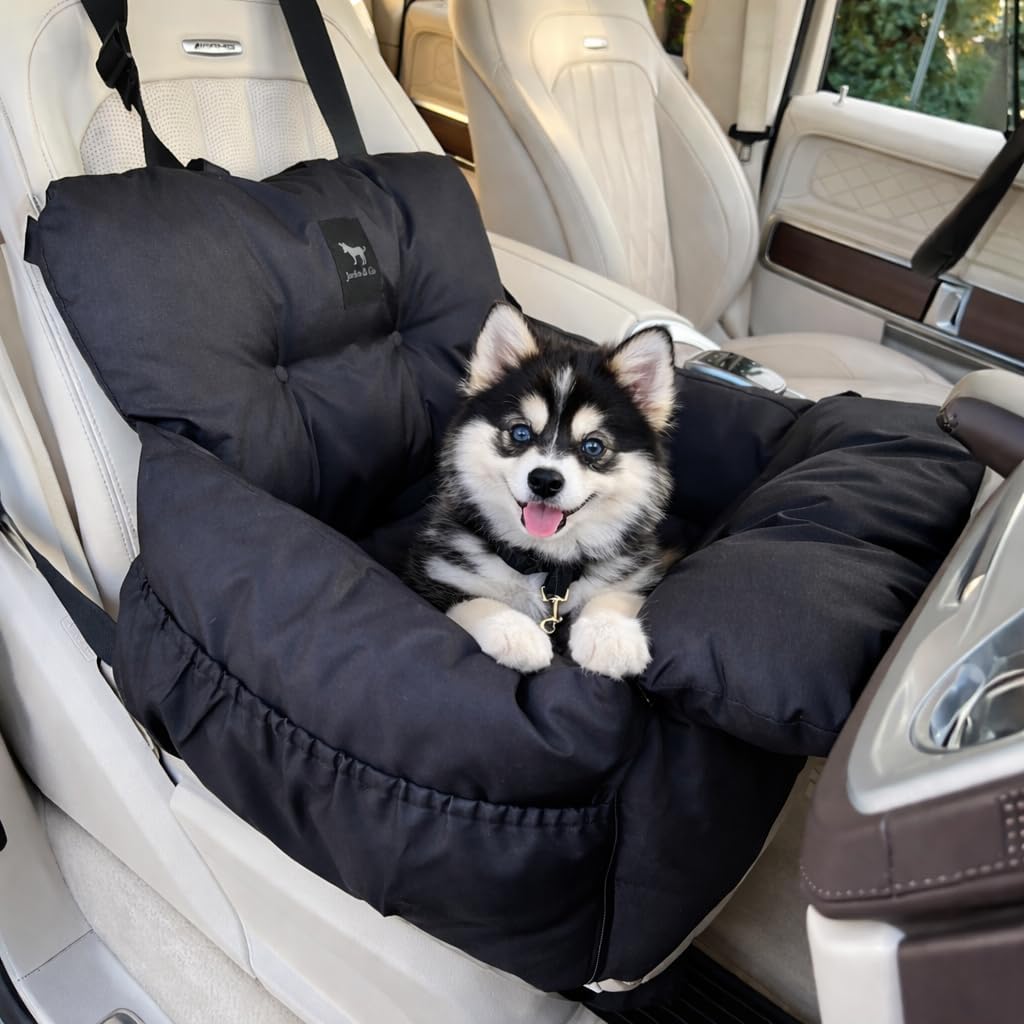 JACKO & CO – Premium Dog Car Seat Bed for Small & Medium Dogs, Soft Travel Bed & Carrier Bag for Pets, Puppies, Cats Front or Back Seat, Machine Washable & Water Resistant (Black, V1 Small (1-25lbs)