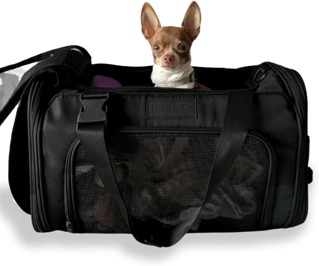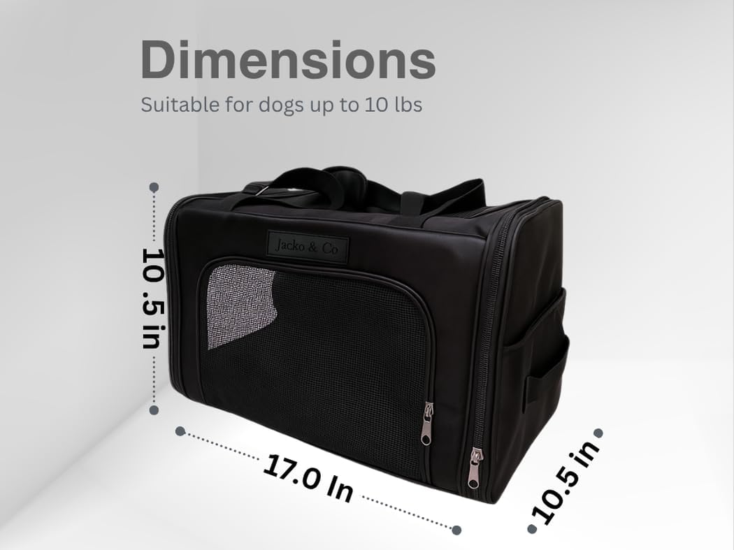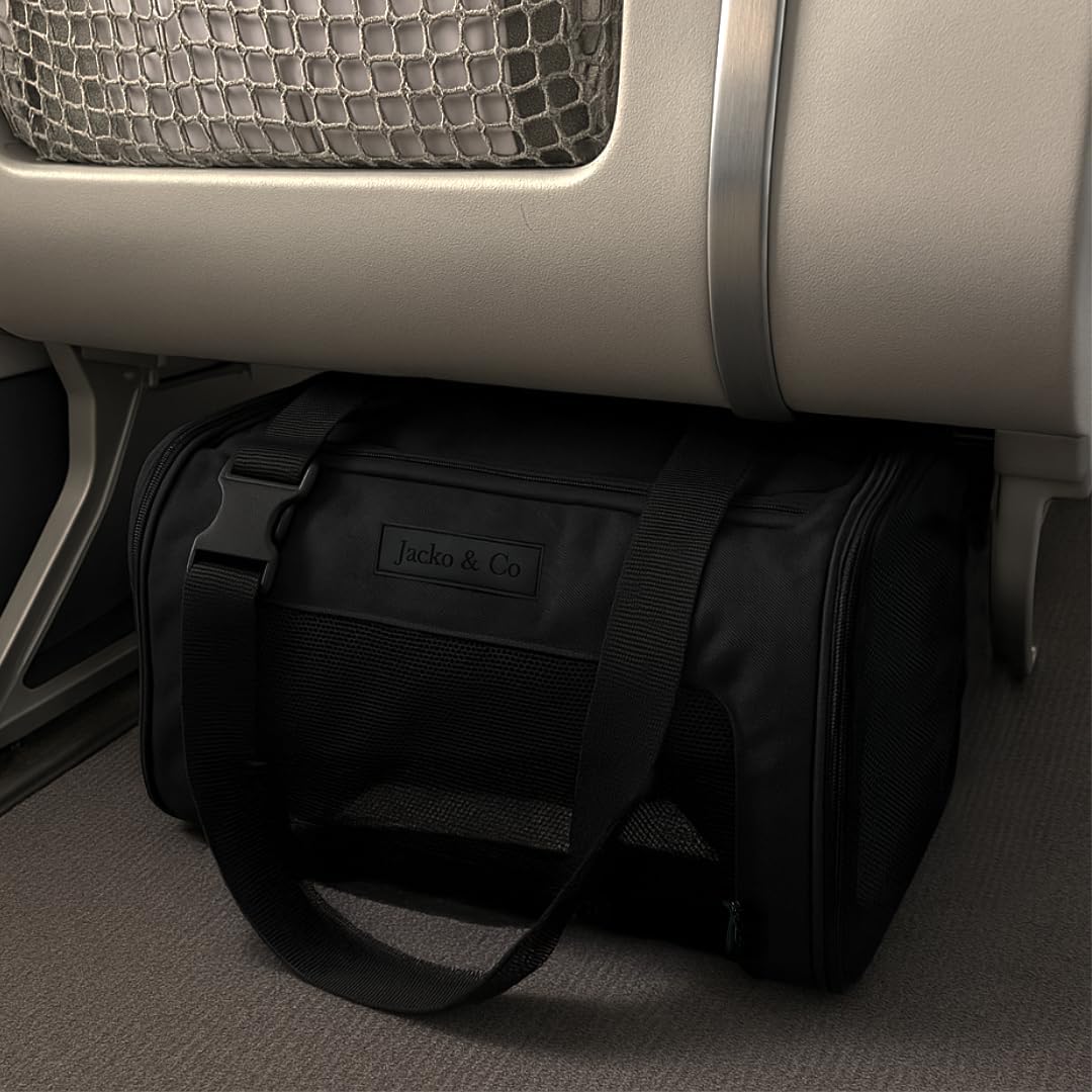 JACKO & CO – Premium Dog & Cat Carrier up to 8lbs, TSA Airline Approved with Luggage Loop, Soft-Sided Travel Carrier Bag for Pets, Small Dogs, Puppies, Kittens, Ventilated Windows & Fully Collapsible