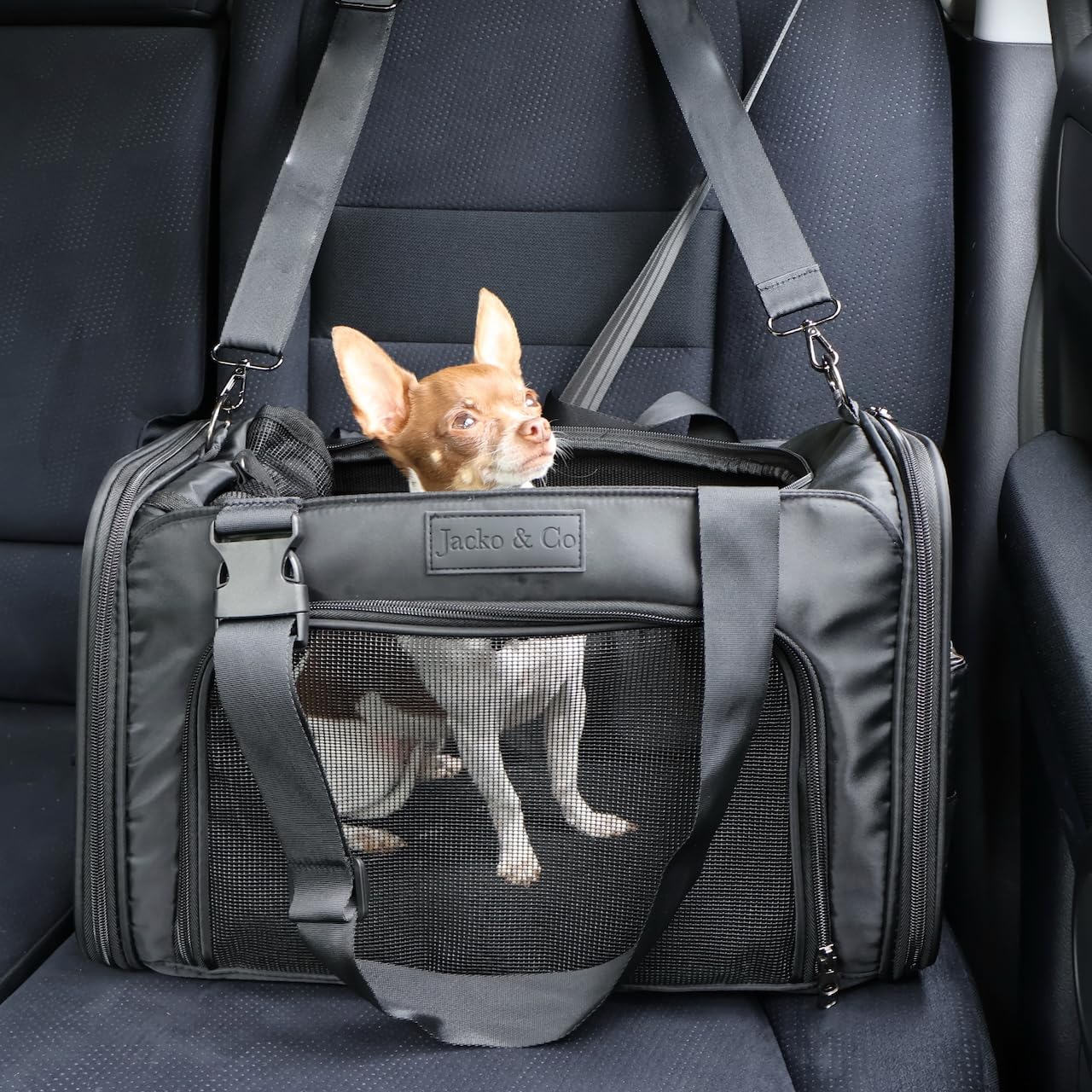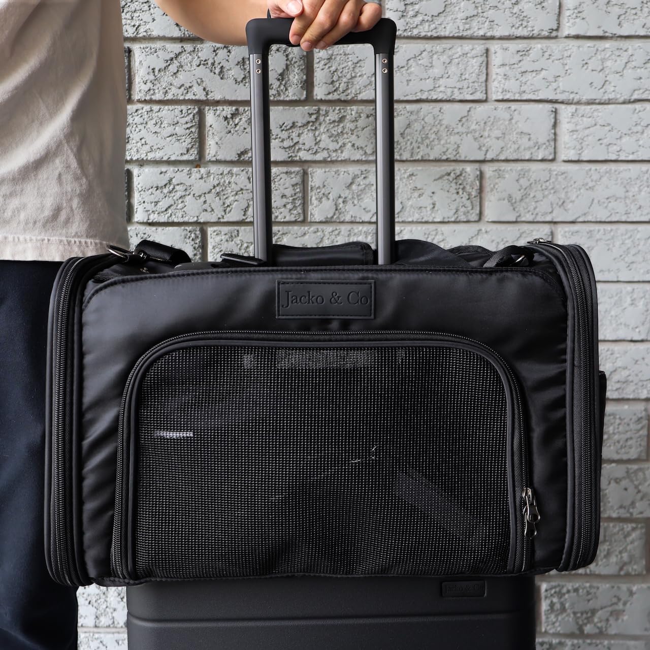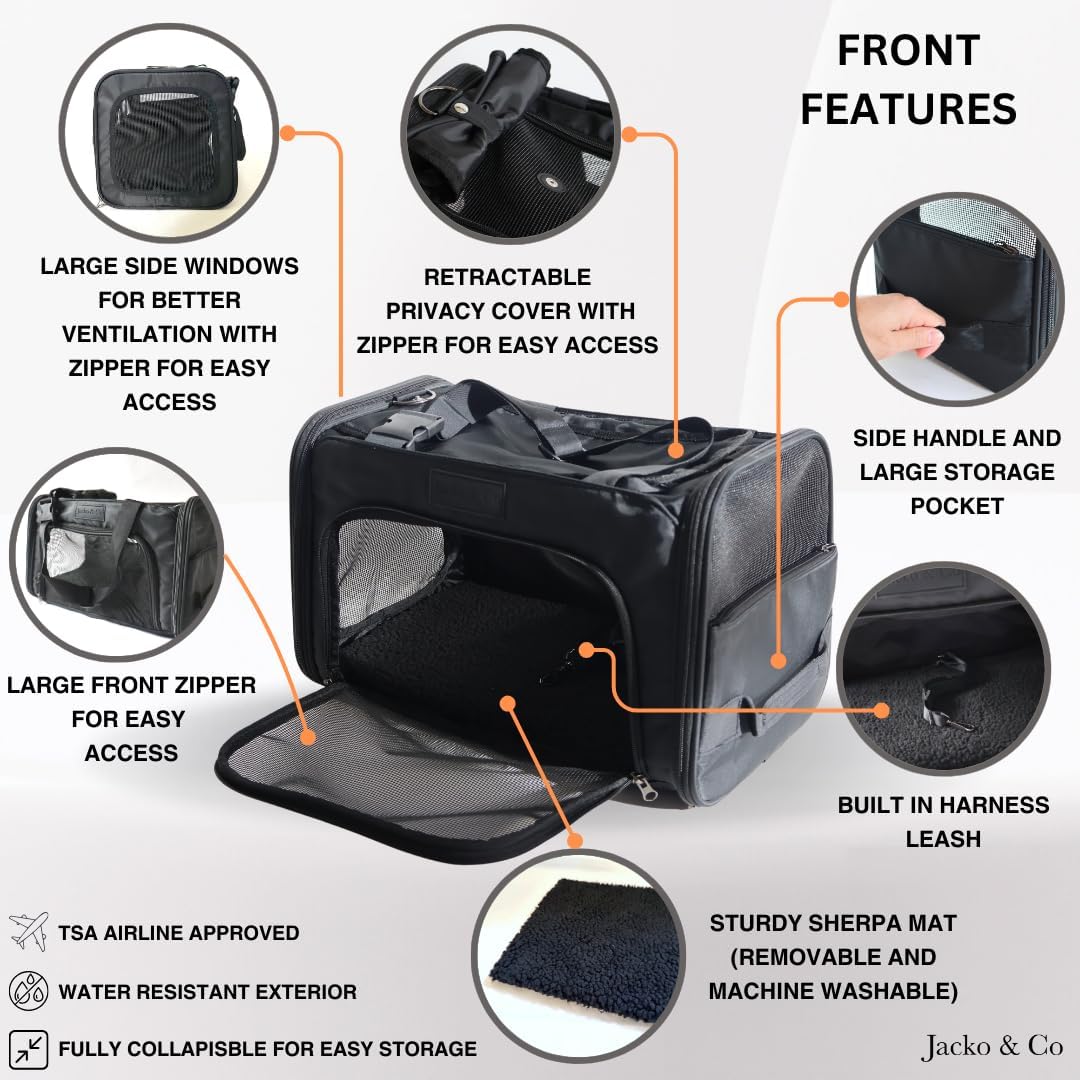 JACKO & CO – Premium Dog & Cat Carrier up to 8lbs, TSA Airline Approved with Luggage Loop, Soft-Sided Travel Carrier Bag for Pets, Small Dogs, Puppies, Kittens, Ventilated Windows & Fully Collapsible