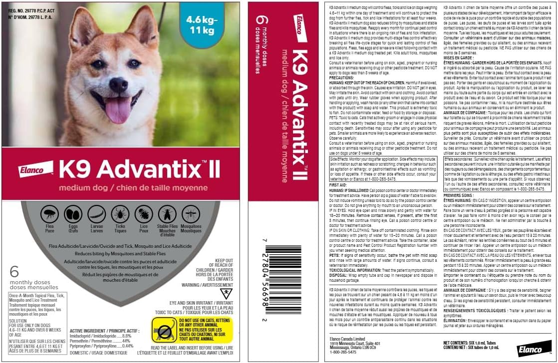 K9 Advantix II Flea and Tick Treatment for Medium Dogs weighing 4.6 kg to 11 kg (10 lbs. to 24 lbs.)-6 doses