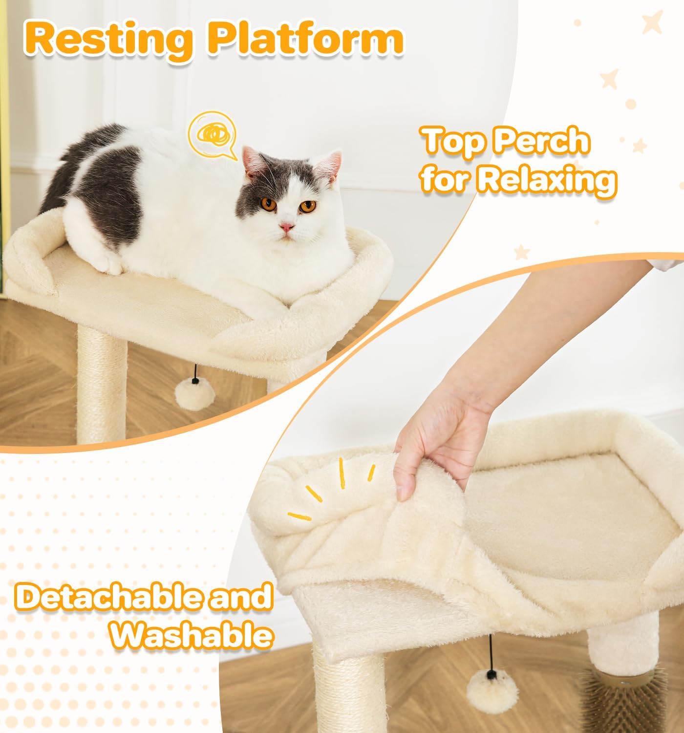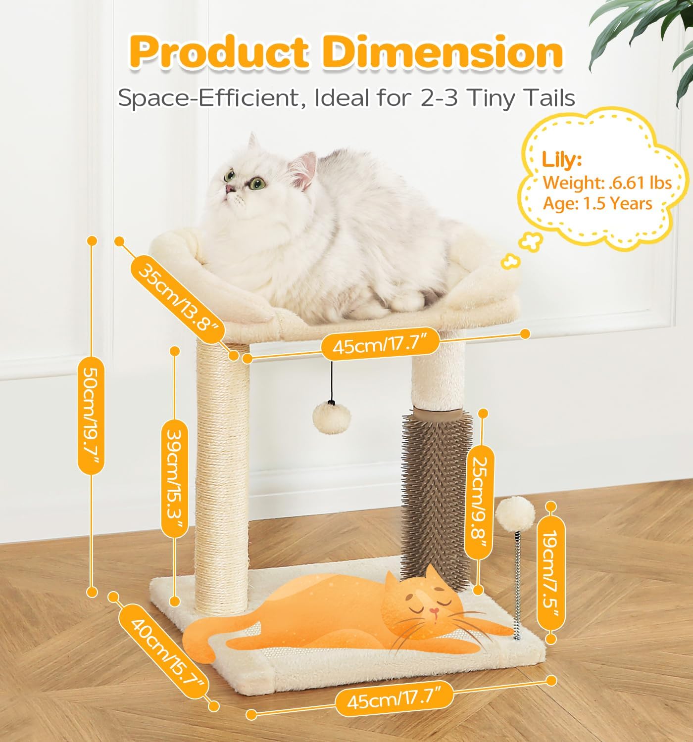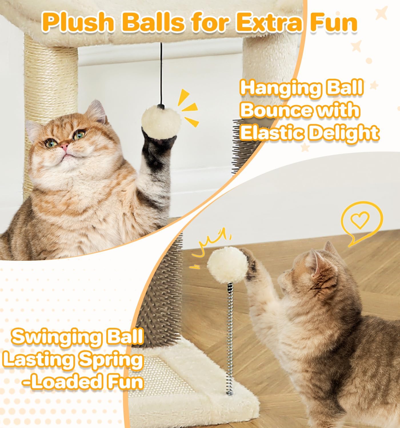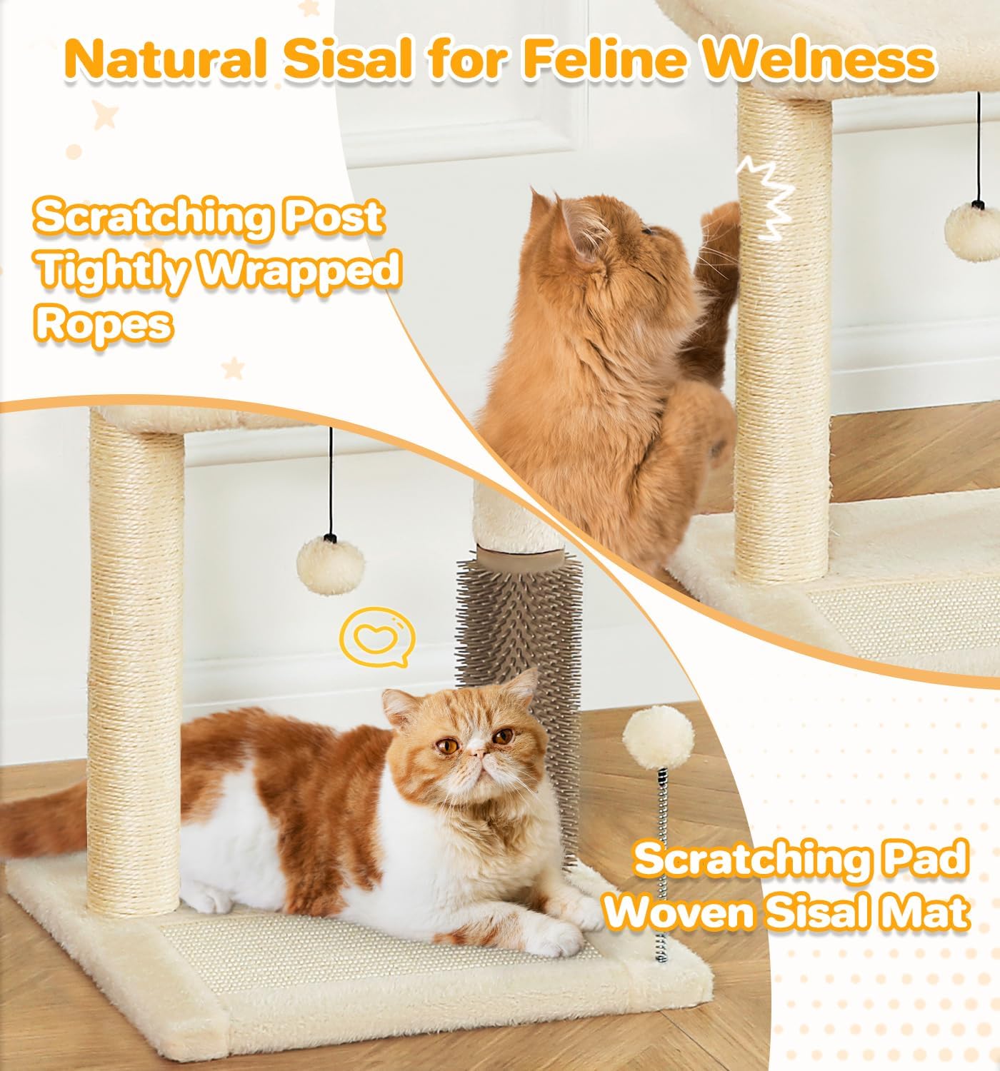 Made4Pets Cat Scratching Post with Large Cat Bed Perch for Indoor Cats, Small Cat Tree Tower with Sisal Cat Scratcher Post & Pad 6-in-1 with Self Groomer Brush & 2 Toy Balls for Kittens, Beige