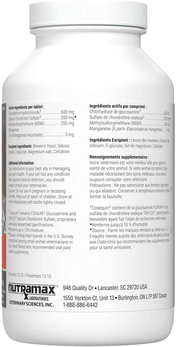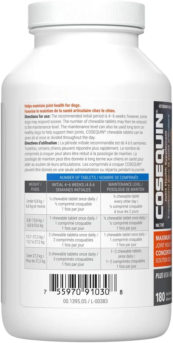 Nutramax Cosequin DS Plus with MSM Chewable Tablets are designed to support your dog's joint health. Each bottle contains 180 chewable tablets, making it a convenient option for pet owners. These tablets are formulated with a combination of glucosamine, chondroitin, and MSM to help maintain healthy cartilage and joint function.