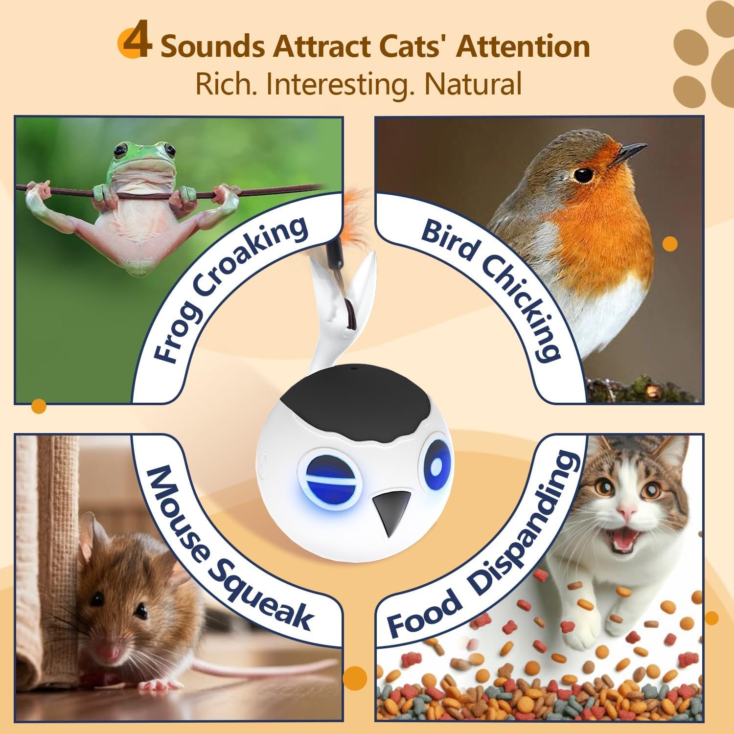 ORSDA Cat Toys, Interactive Cat Toy Ball for Indoor Cats, Automatic Moving Ball Bird Toy for Bored Indoor Kitten, Motion Activated Fast Moving Chirping Stimulating Light, 2 Feather Tails, White