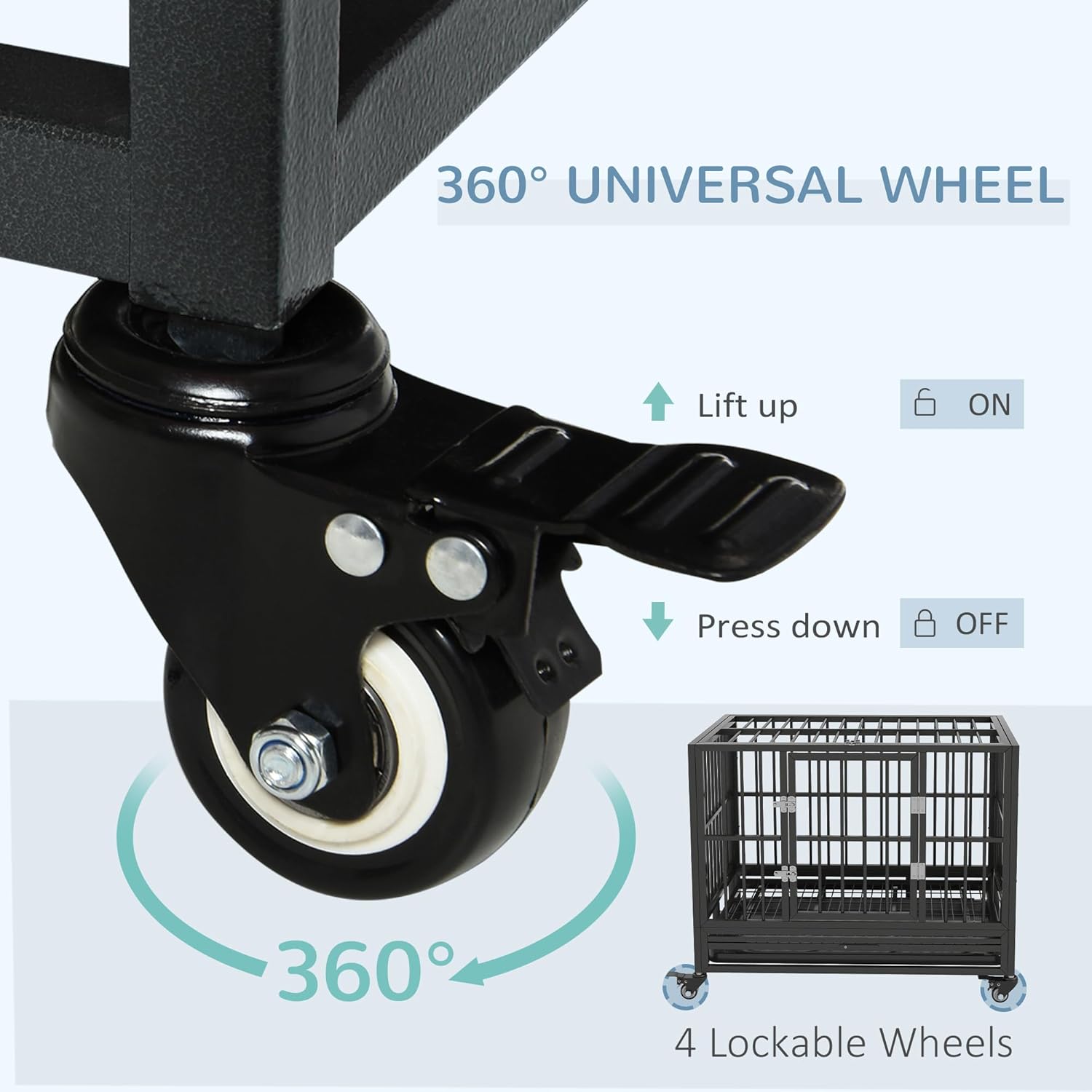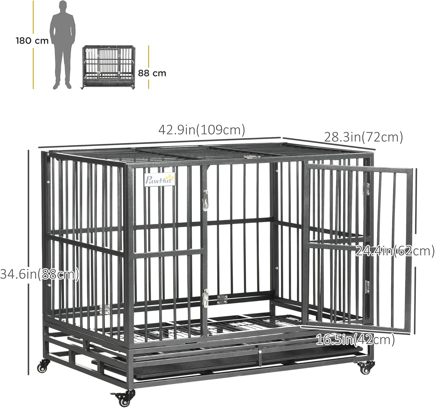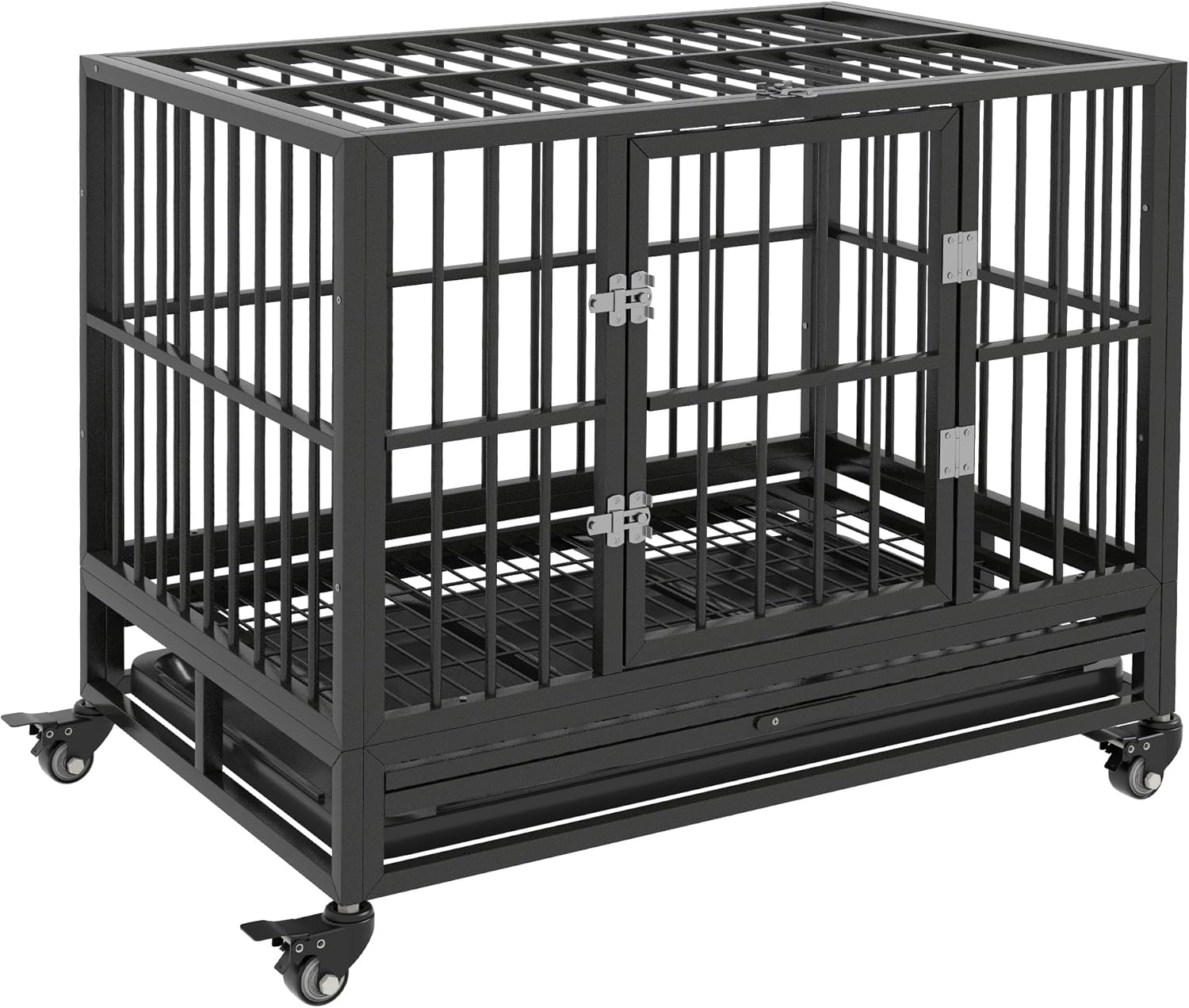 The PawHut Heavy Duty Steel Dog Crate is designed for both comfort and security for your pet. Made from solid steel gauge tubes, this kennel ensures durability and strength. It features a convenient slide-out panel that simplifies cleaning and maintenance, making it easier for pet owners to keep the crate tidy. The rolling caster wheels provide portability, allowing you to move the crate with ease. With dimensions of 36.2" L x 24.4" W x 30.7" H, it is suitable for various dog sizes.