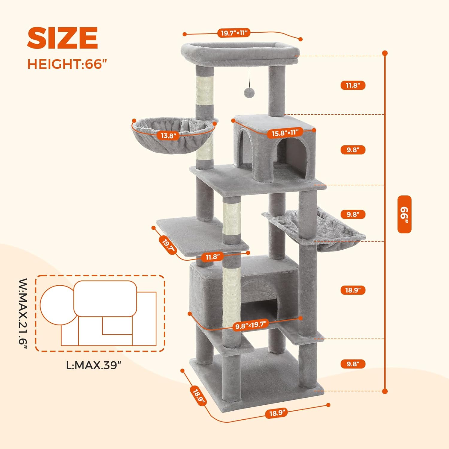PAWZ Road 66.5” Cat Tree for Large Cats, Multi-Level Cat Tower for Indoor Cats with Natural Sisal Scratching Post, Cozy Hammock, Cat Condo and Soft Perch, Grey