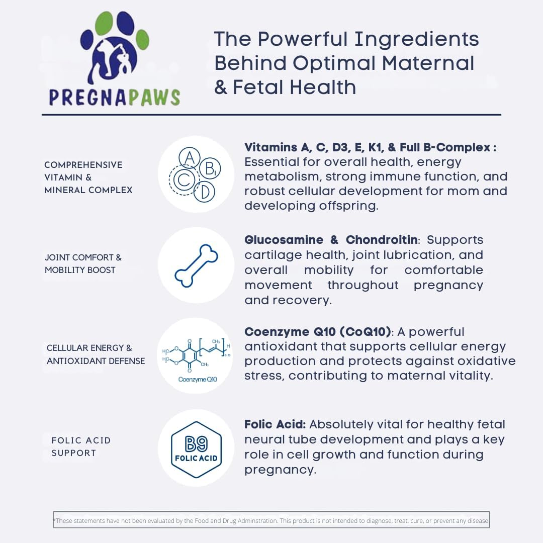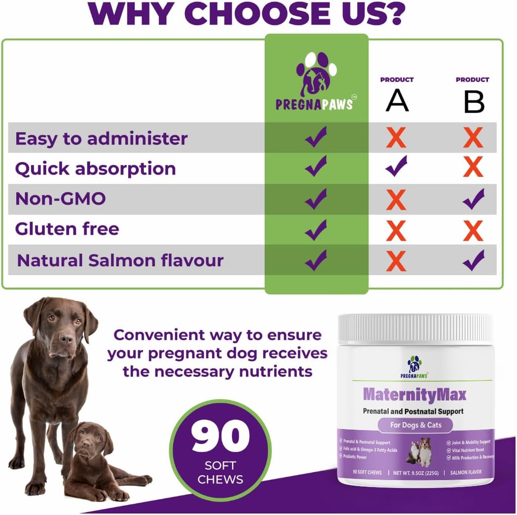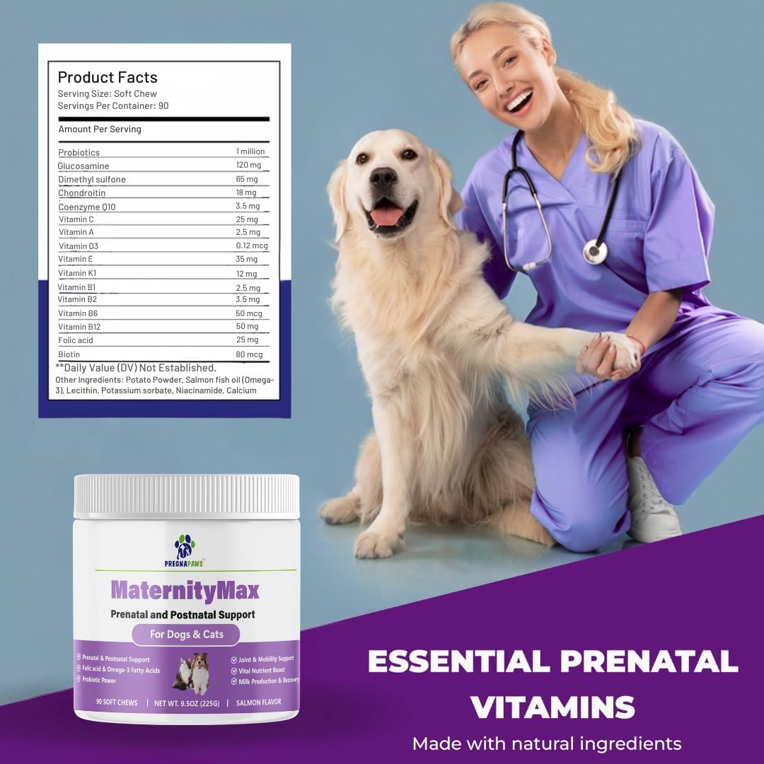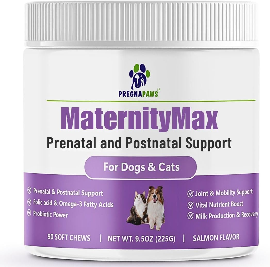 Pregnapaws MaternityMax Prenatal and Postnatal Vitamins are designed to support the health of pregnant and nursing pets. These soft chews are formulated with essential vitamins and nutrients to aid in puppy development and maternal health. Each chew contains probiotics, glucosamine, MSM, CoQ10, and folic acid, ensuring your pet receives comprehensive support during this critical time.