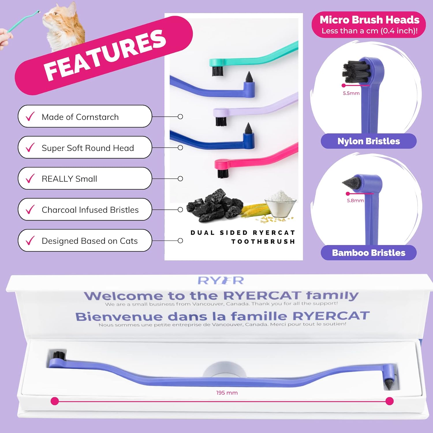 RYERCAT Amethyst Dual Sided Cat Toothbrush – Kitten Toothbrush with Micro Head (Very Small) to fit into Cat/Kittens Mouth – Cat Dental Care Supplies – Pet Toothbrush for Cats – Kitten Toothbrush