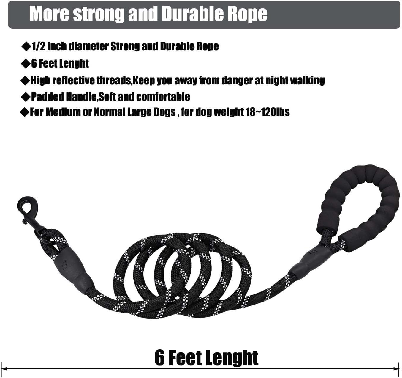 Strong Heavy Duty Dog Leash for Large Dogs with Padded Handle – 6FT,10FT,15FT,30FT,50FT Long Dog Leads, Durable Pet Training Leash for Medium & Small Dogs (6FT1/2Inch,Black)