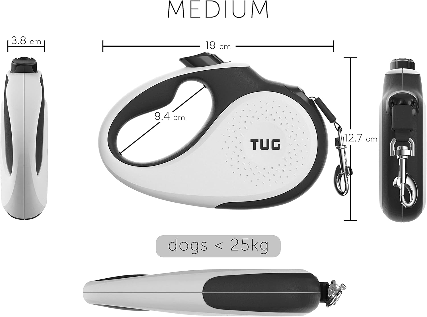 TUG 360° Tangle-Free Retractable Dog Leash for Up to 25 kg Dogs | 5 m Strong Nylon Tape/Ribbon | One-Handed Brake, Pause, Lock (Medium, White)
