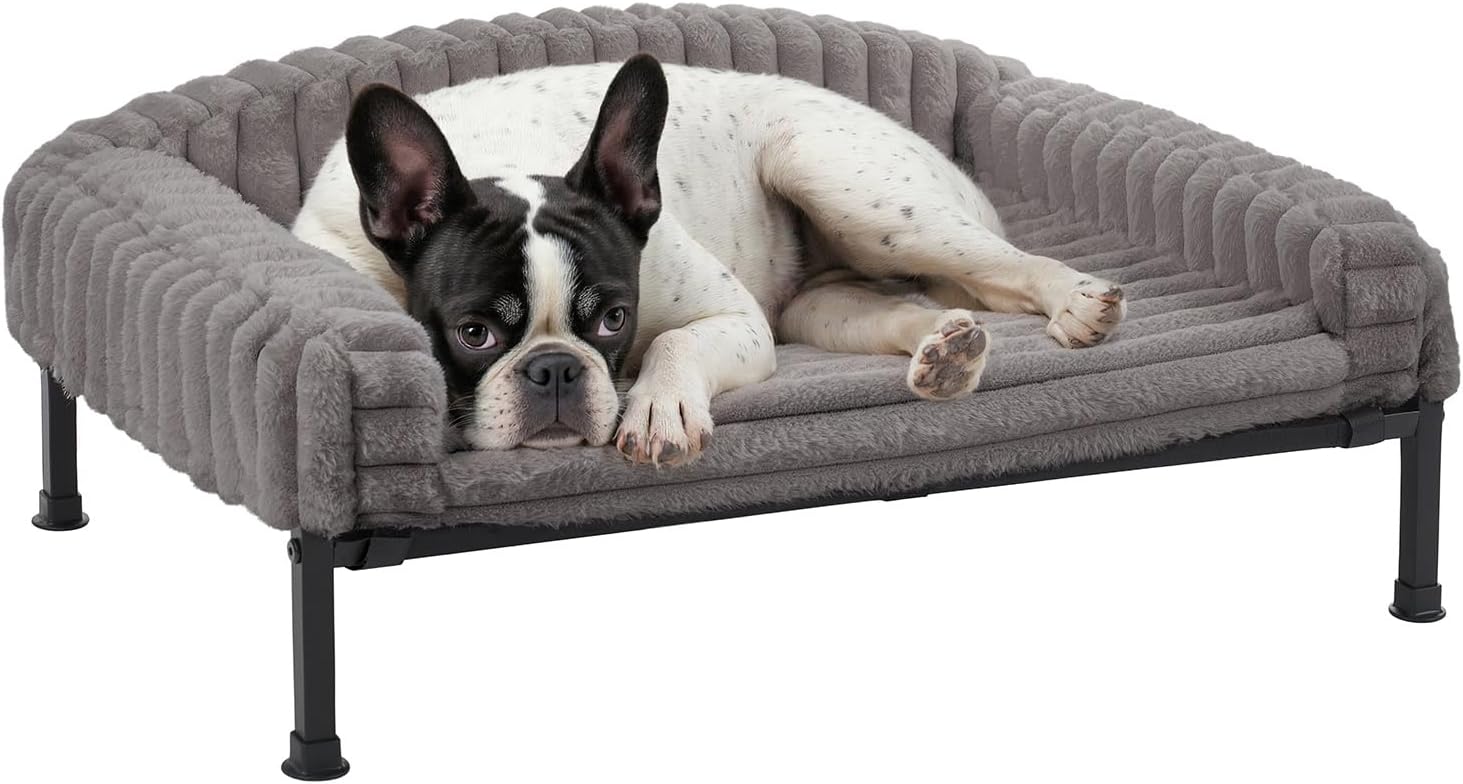 Veehoo Orthopedic Elevated Dog Bed with Bolster Cushion, Fluffy Plush Dog Couch Beds for Small Dogs, Cats, Washable Cozy Raised Pet Cot with Non-Slip Feet for Indoor or Patios Use, Gray, 24×18 Inches